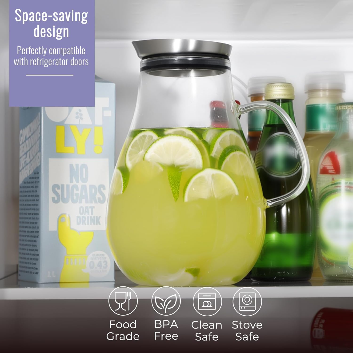 - Unique space saving design: WARMSIMPLE has launched a streamlined glass pitcher with a lid that can be perfectly placed in the fridge, freeing up valuable space in the refrigerator. Say goodbye to bulky glass pitchers occupying your refrigerator shelves!