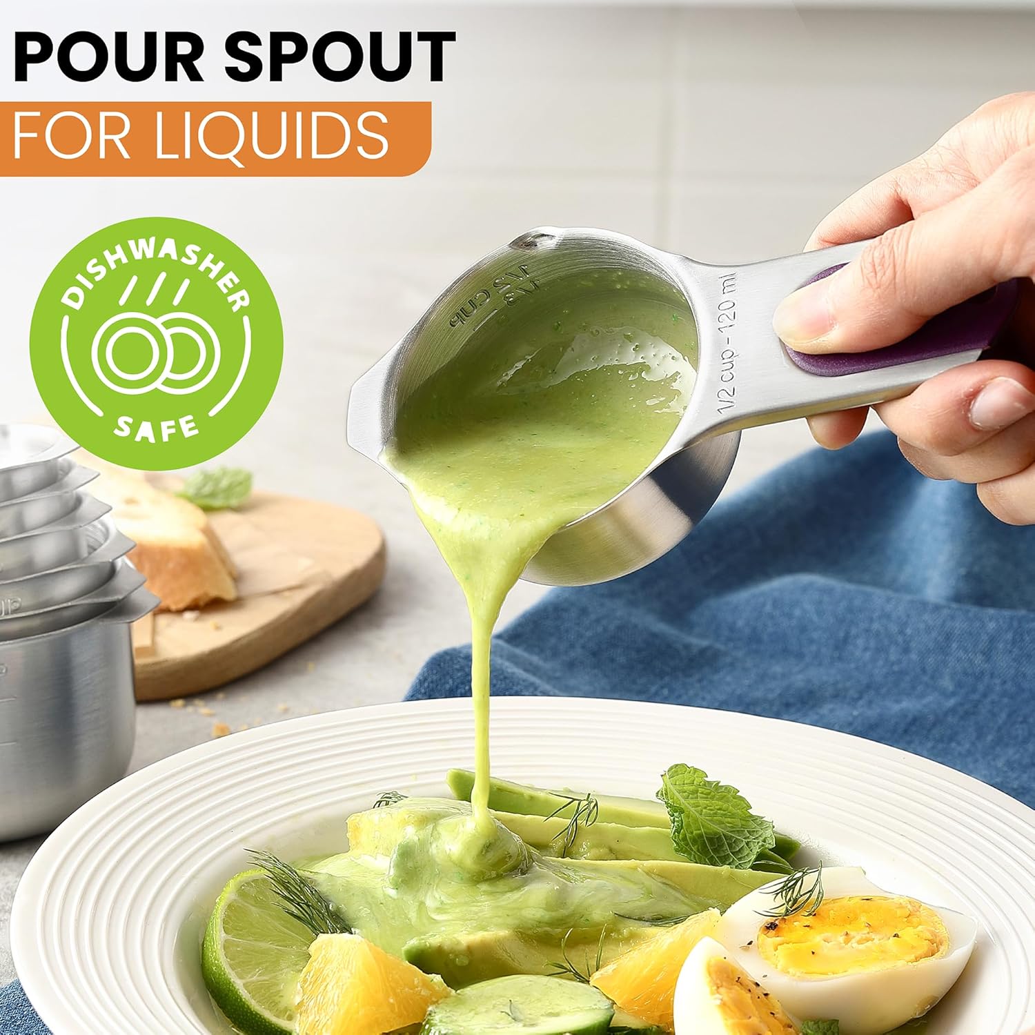 - Stylish Set - The beautiful look of this set will enhance any kitchen tools collection. Made of sturdy, heavy and durable 304 Stainless Steel that is rust proof and stain proof and built to last. The cups even have an easy-pour spout. The entire set is Dishwasher safe.