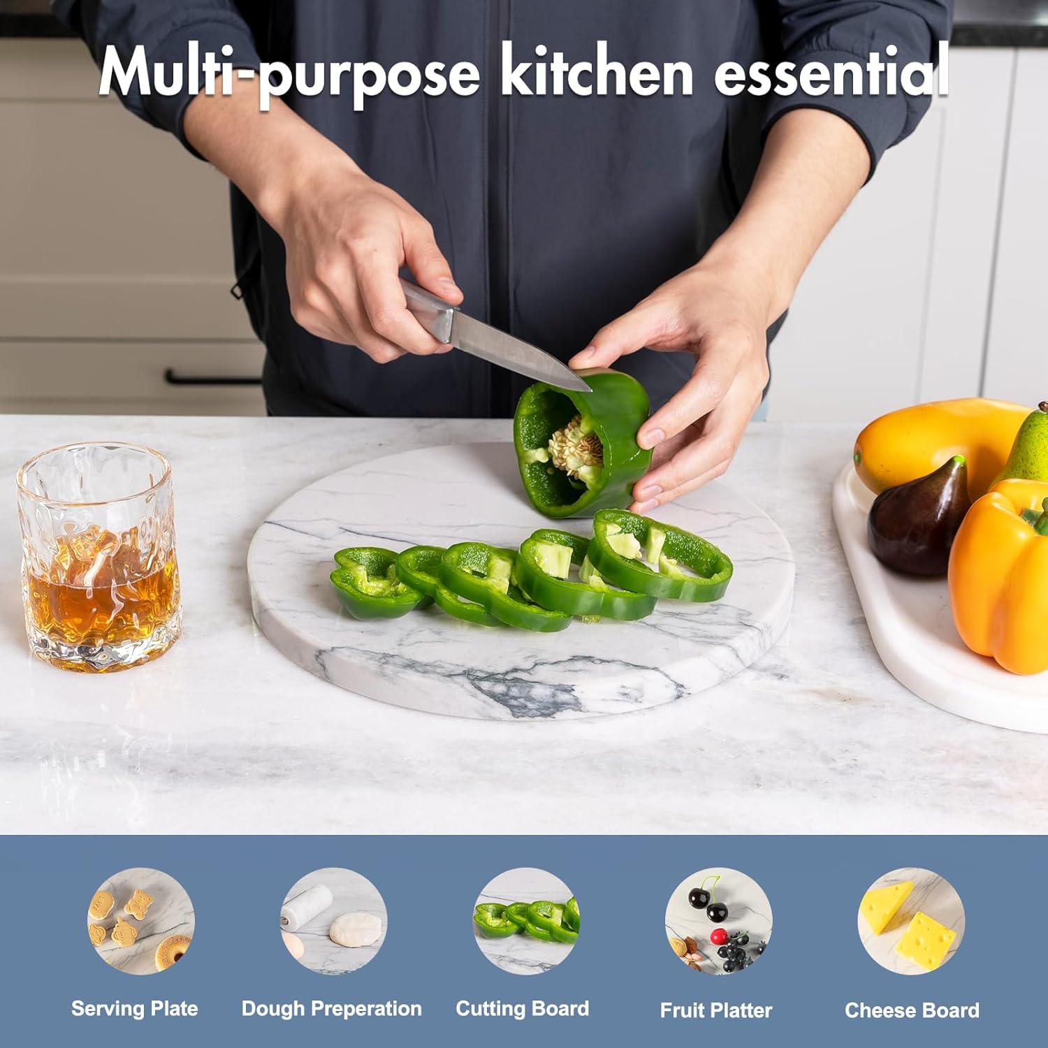 - Superior Durability – Resistant to Wear, Gentle on Knives Constructed from high-density marble, this board is built to endure daily use without compromising its polished look. It resists scratches and nicks while offering a solid yet forgiving surface that protects your knives, making it an ideal long-term investment in both beauty and function.