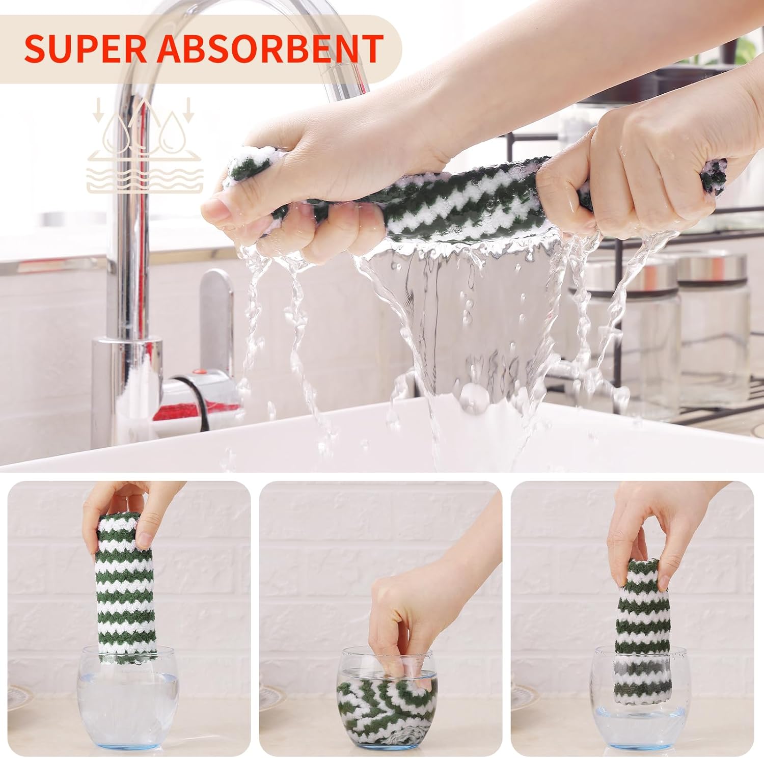 Homaxy Kitchen Towels(24 Pack, 10 x 20 inches), Ultra Soft and Absorbent Dish Towels, Reusable Fast Drying Microfiber Cleaning Cloth, Coral Velvet Wave Design No-lint, Grass Green