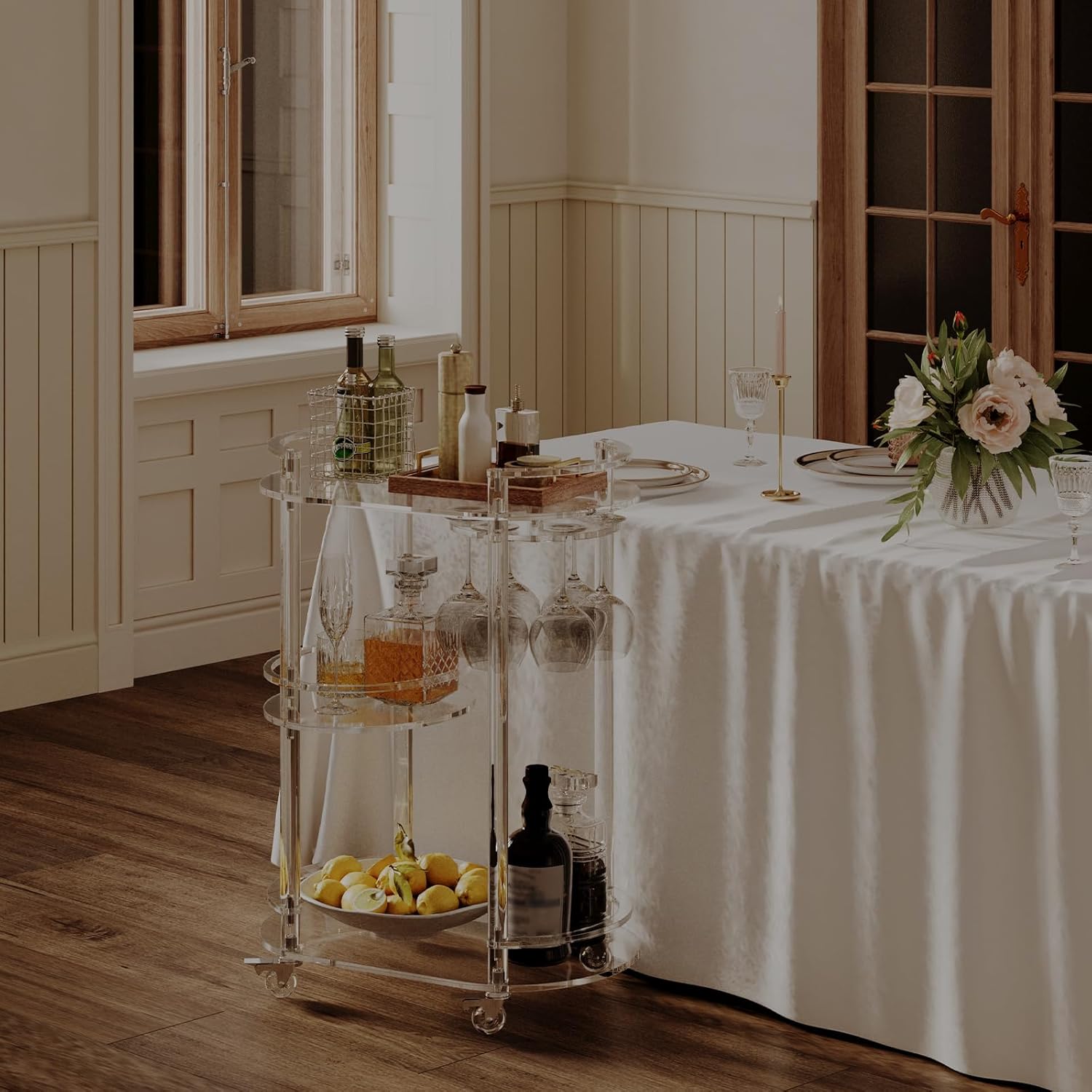 HMYHUM Acrylic Bar Cart with 4 Lockable Wheels, Clear Home Beverage Cart with Glass Holder, 3-Tier Rolling Serving Cart for Kitchen, Dining Room, Modern, Oval, 15''D x 23.6''W x 32.3''H