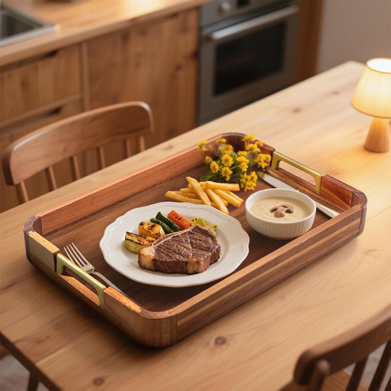 - 【Where Rustic Charm Meets Modern Grace】Warm wood grain dances with sleek gunmetal handles, a fusion of countryside coziness and downtown elegance. Raised edges guard against spills, while wide handles promise steady carrying. Serve pancakes or pinot noir with equal poise.
