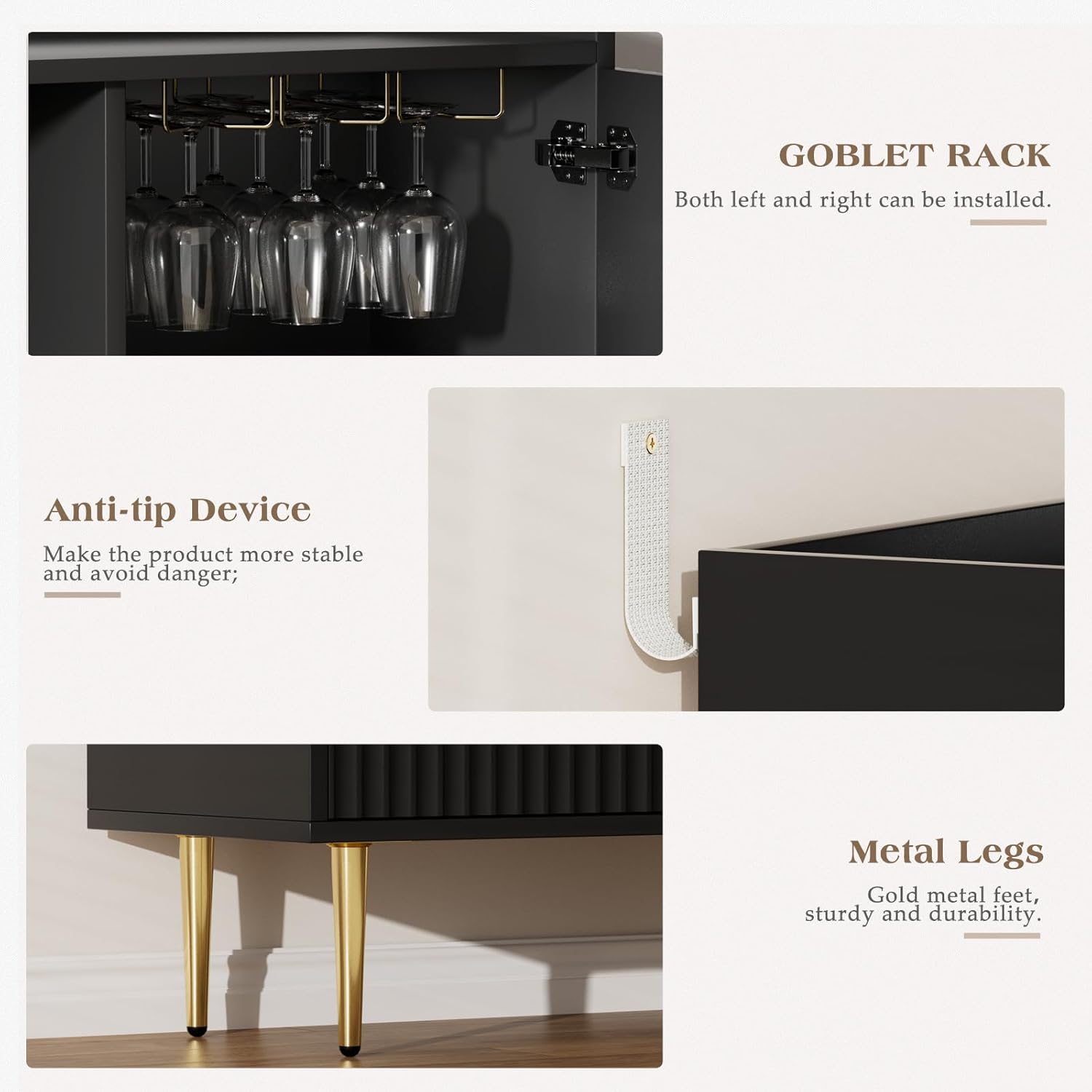 - Fashionable and Beautiful: EOYUTLLY black liquor cabinet with 2 fluted textured doors, gold metal handles and legs, Whether it's in your living room, dining room or kitchen, it blends in perfectly with the rest of your decor, providing storage space and a sleek, beautiful look for your room