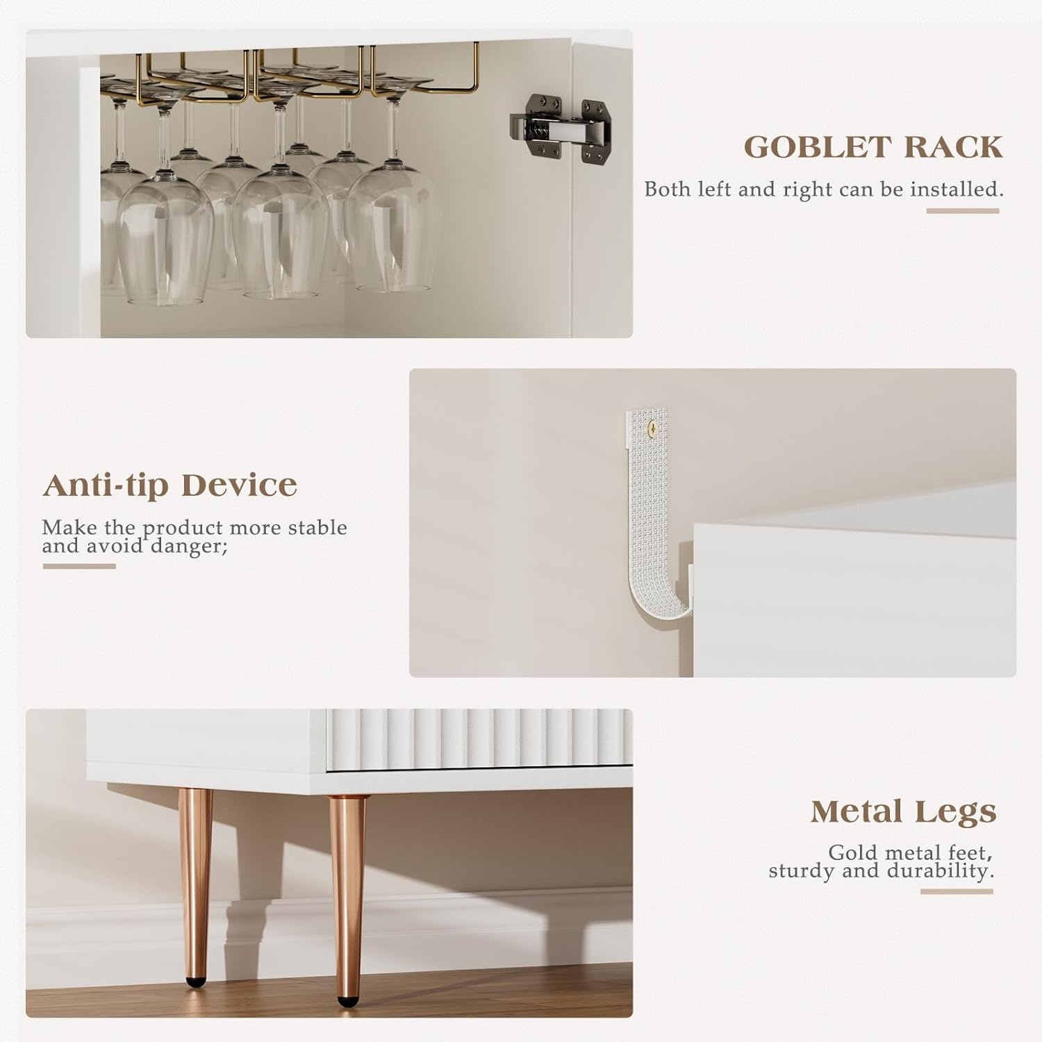 - Fashionable and Beautiful: EOYUTLLY white liquor cabinet with 2 fluted textured doors, rose gold metal handles and legs, Whether it's in your living room, dining room or kitchen, it blends in perfectly with the rest of your decor, providing storage space and a sleek, beautiful look for your room