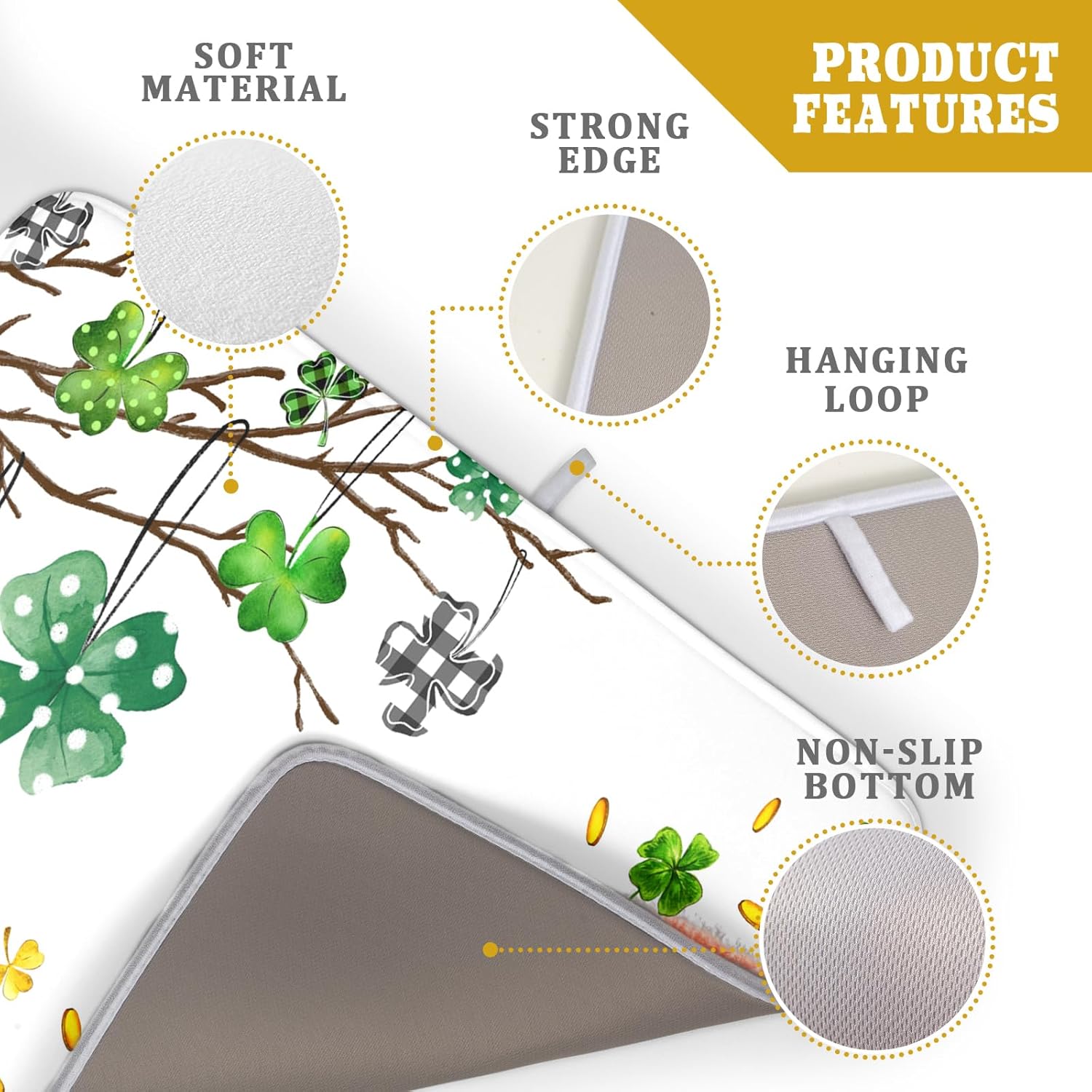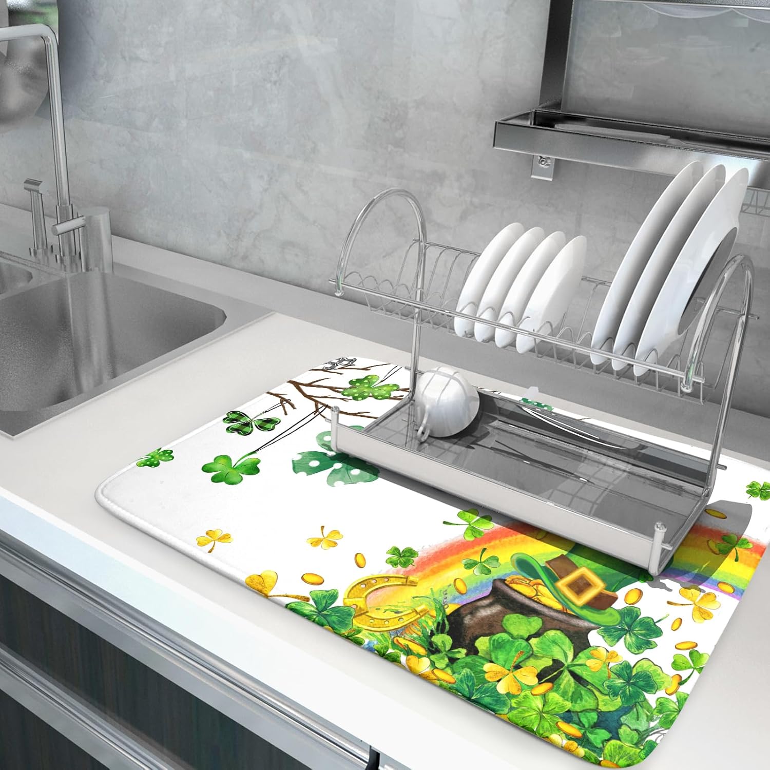 Giwawa St Patrick Dish Drying Mat Large Lucky Clover Tree Shamrock Dish Drainer Mats 18x24inch Spring Elf Hat Rainbow Colorful Fast Drying Absorbent Dish Drying Pad for Kitchen Counter Decor