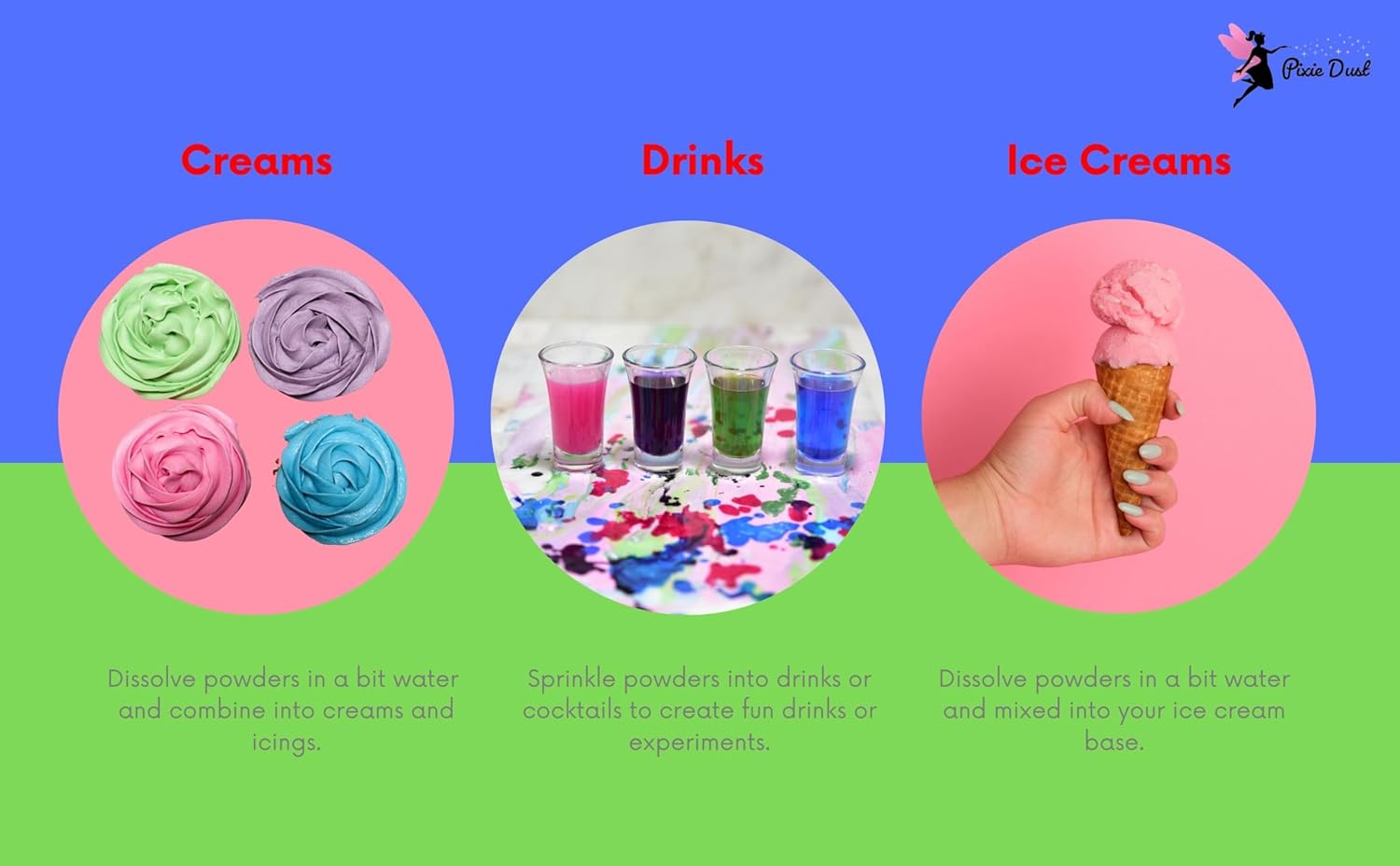 - For using Pixie Dust's coloring powders in liquids: sprinkle powder and mix until desired color is achieved.