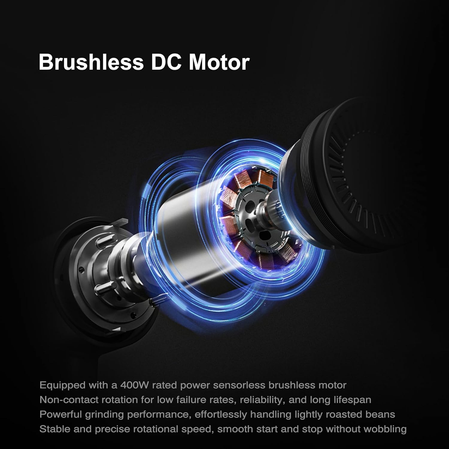 - [ Sensory Brushless Motor ] Our Burr Coffee Grinder uses a zero-friction motor with PID control and Hall elements for smoother operation, longer lifespan, and greater stability. Unlike traditional brushed motors, it doesn’t shake during use, providing a more precise grind every time.