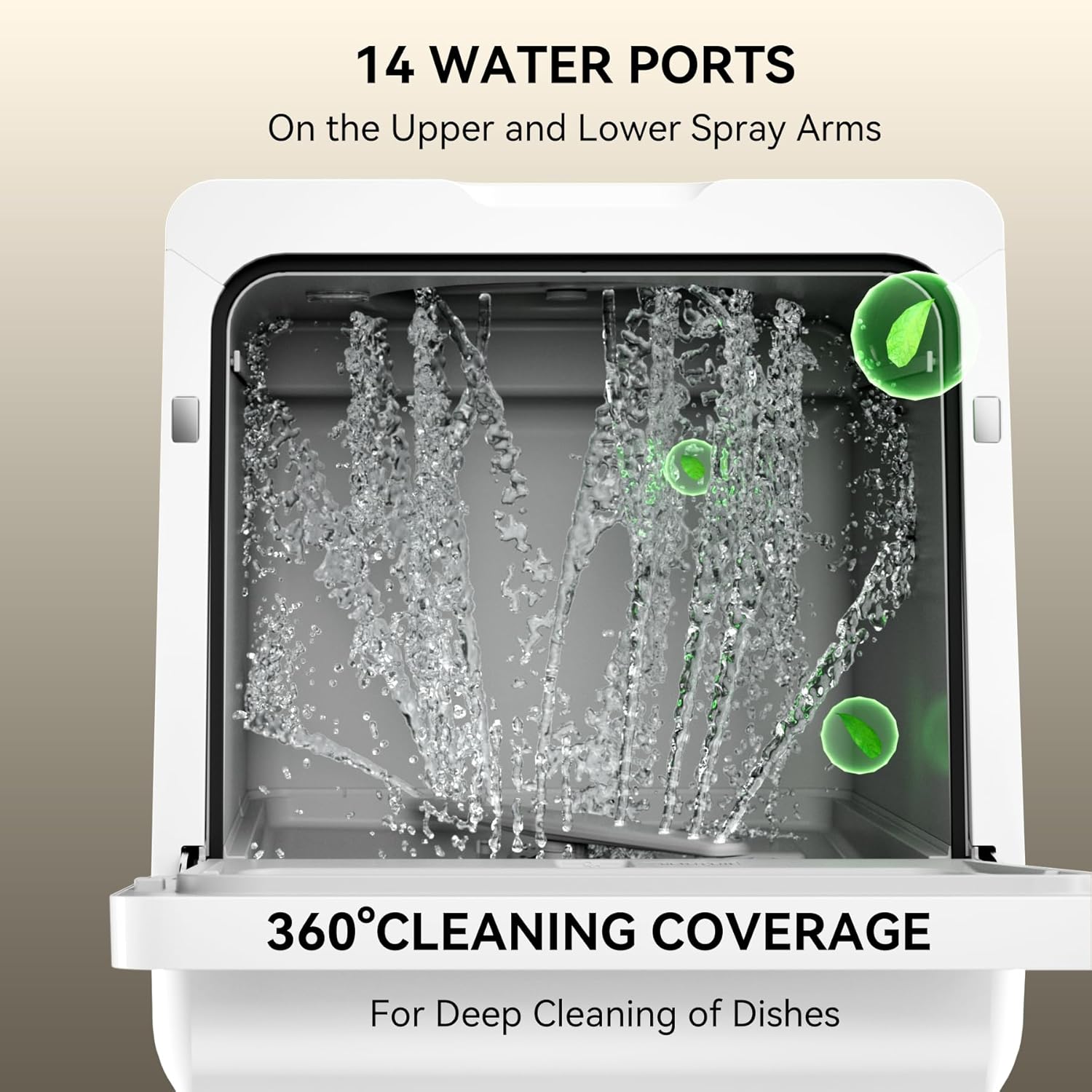 - ă360° All-AROUND CLEANINGăThe spray arms feature 14 water jets that spray from both the top and bottom, achieving a 360° cleaning coverage. This ensures a meticulous rinse, imparting a gleaming, pristine finish to your dishes.
