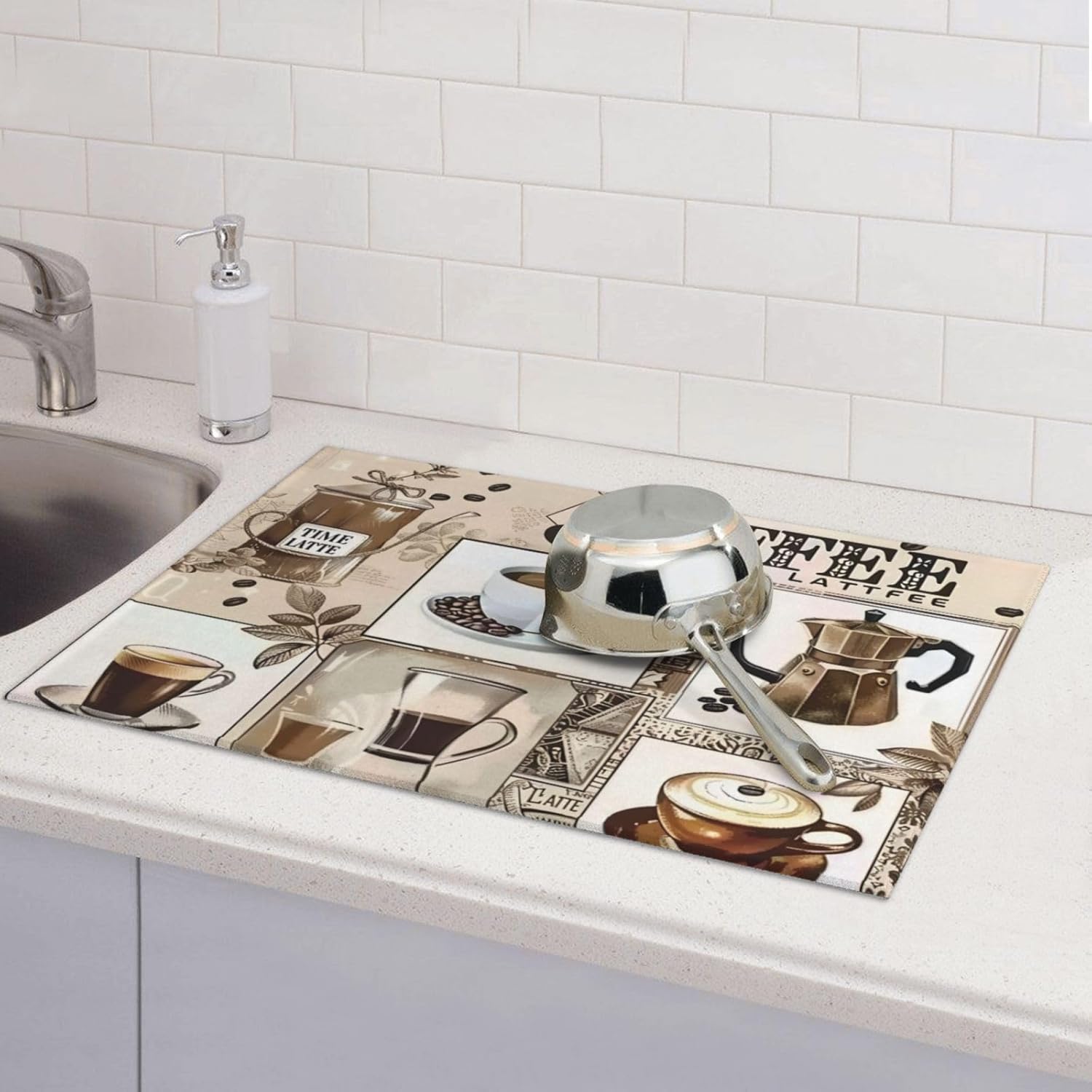 - Widely Used -- The Dish Drying Pad Can Be Placed Anywhere You Need To Absorb Water, Such As Can Be Used On Kitchen Counters, Countertops, Dining Table, Sinks, And Under Dish Racks, Coffee Makers, Coffee Machines, Coffee Pots, Espresso Machines, Coffee Cups, Water Dispensers, Blenders, Also As A Pet Food Mat, Place It Under Pet Drinking Pot To Keep The Floor Dry