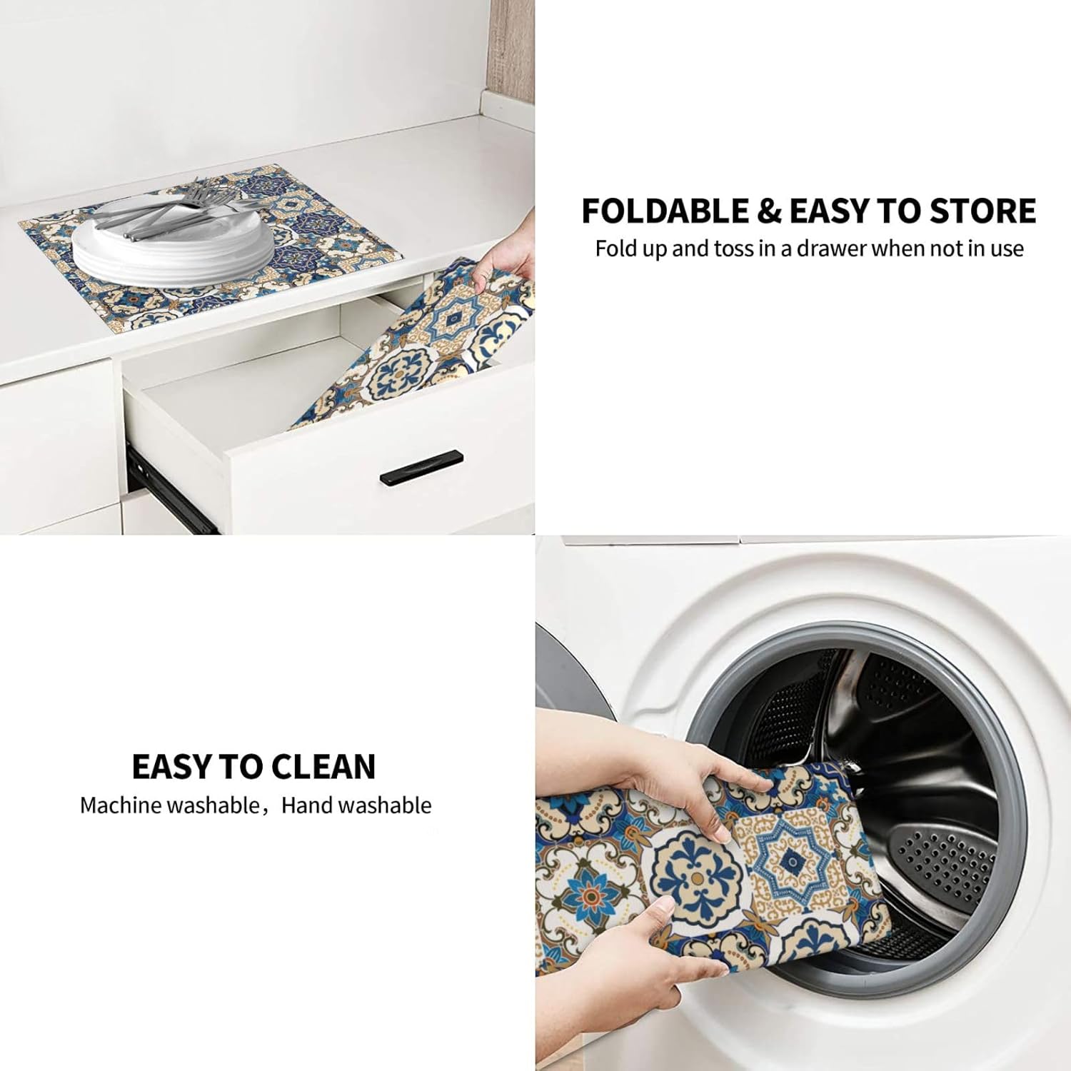 - Easy To Clean & Store -- The Drying Mat Is Machine Washable, Easy To Clean And Store. Fold And Slip Into A Drawer Or Cabinet When Not In Use. The Mat Can Also Be Hung On The Hook With The Tape