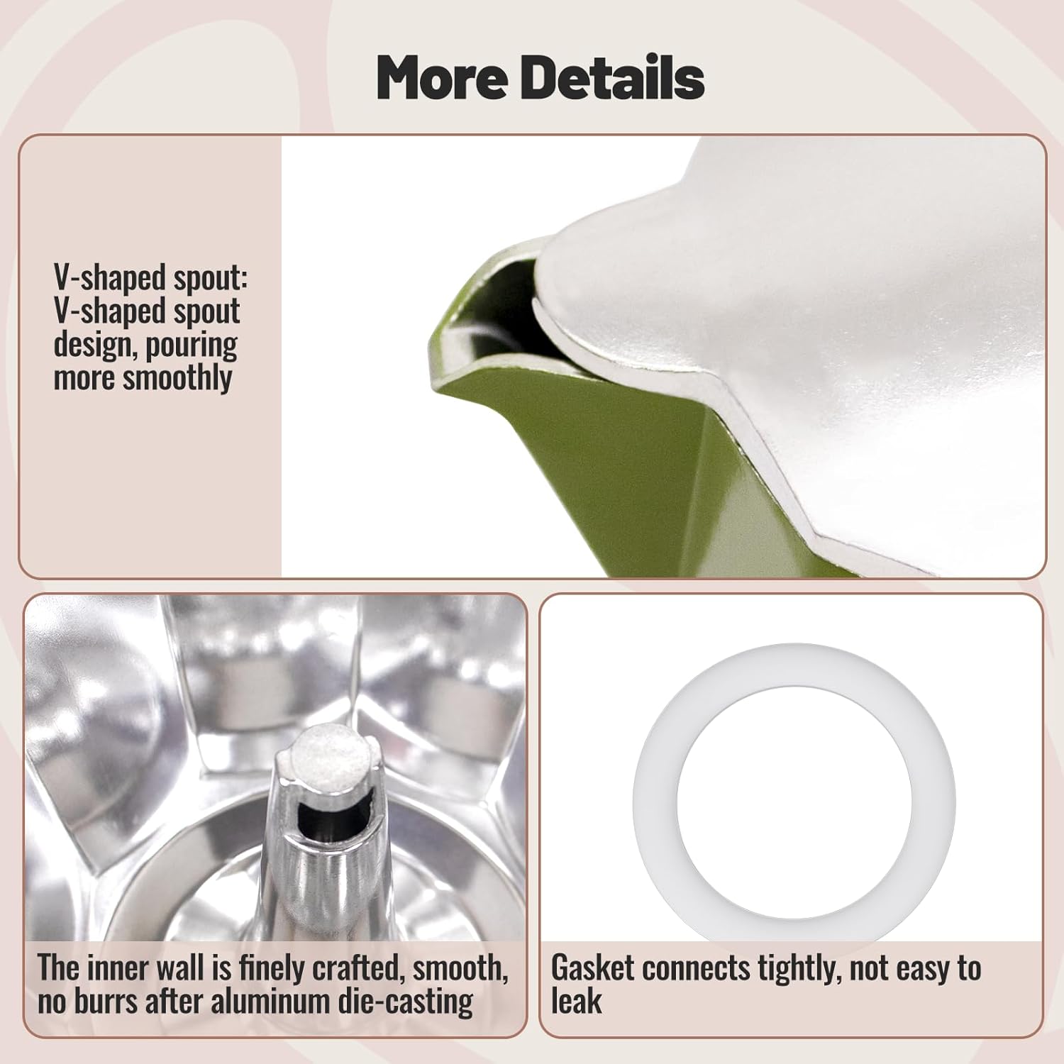 - Exquisite Taste Experience: Elevate your coffee moments with our Moka pot. It's not just about the incredible taste of your cup of coffee; it's about the whole experience. Unleash your creativity and prepare personalized, smooth, and rich brews for your loved ones, evoking elegance and style, regardless of the occasion or setting