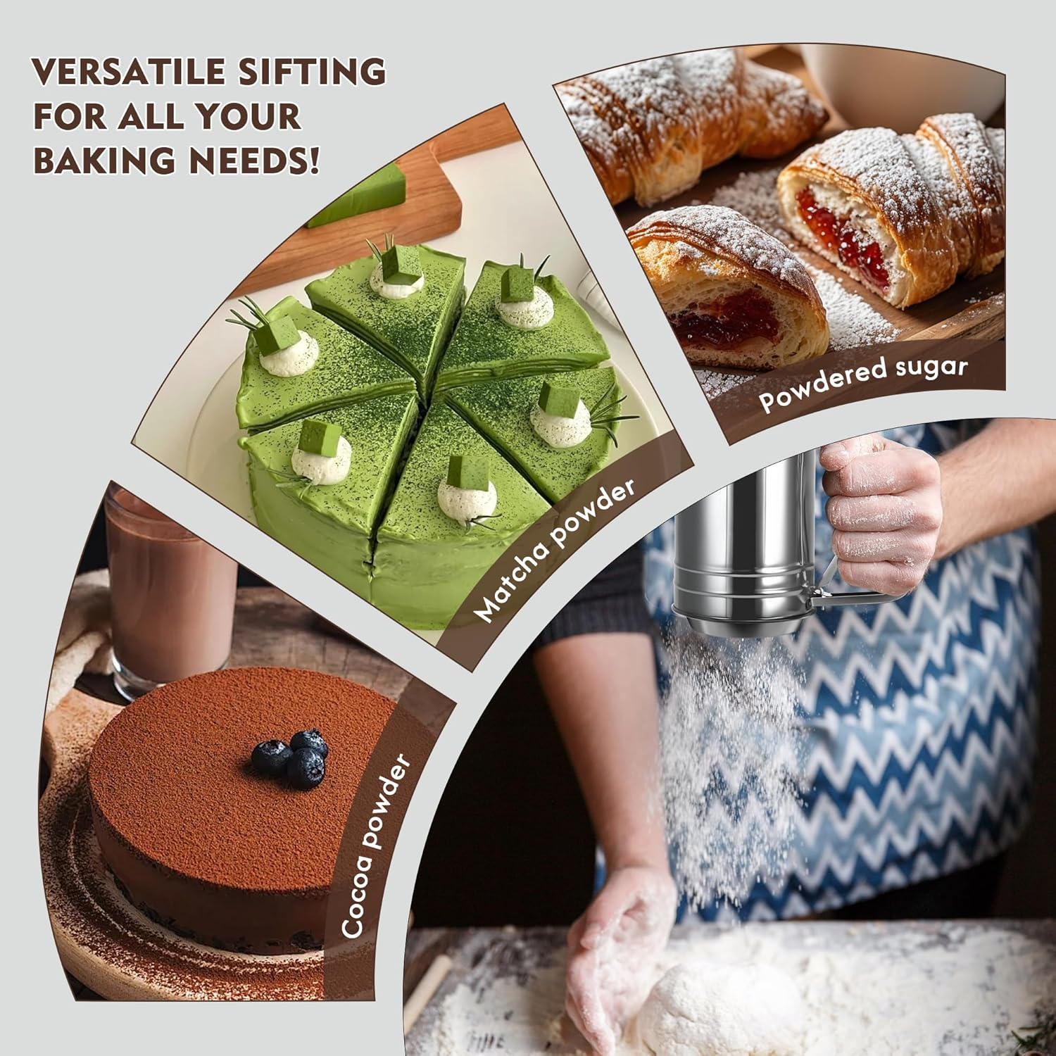 - 【Advanced Double-Layer Fine Mesh Design】 Featuring an innovative double-layer fine mesh system, this baking sifter ensures ultra-smooth results every time. The dual-layer design effectively prevents clumping while providing superior aeration for your dry ingredients, resulting in lighter, fluffier baked goods. Perfect for flour, powdered sugar, cocoa powder, and other fine ingredients