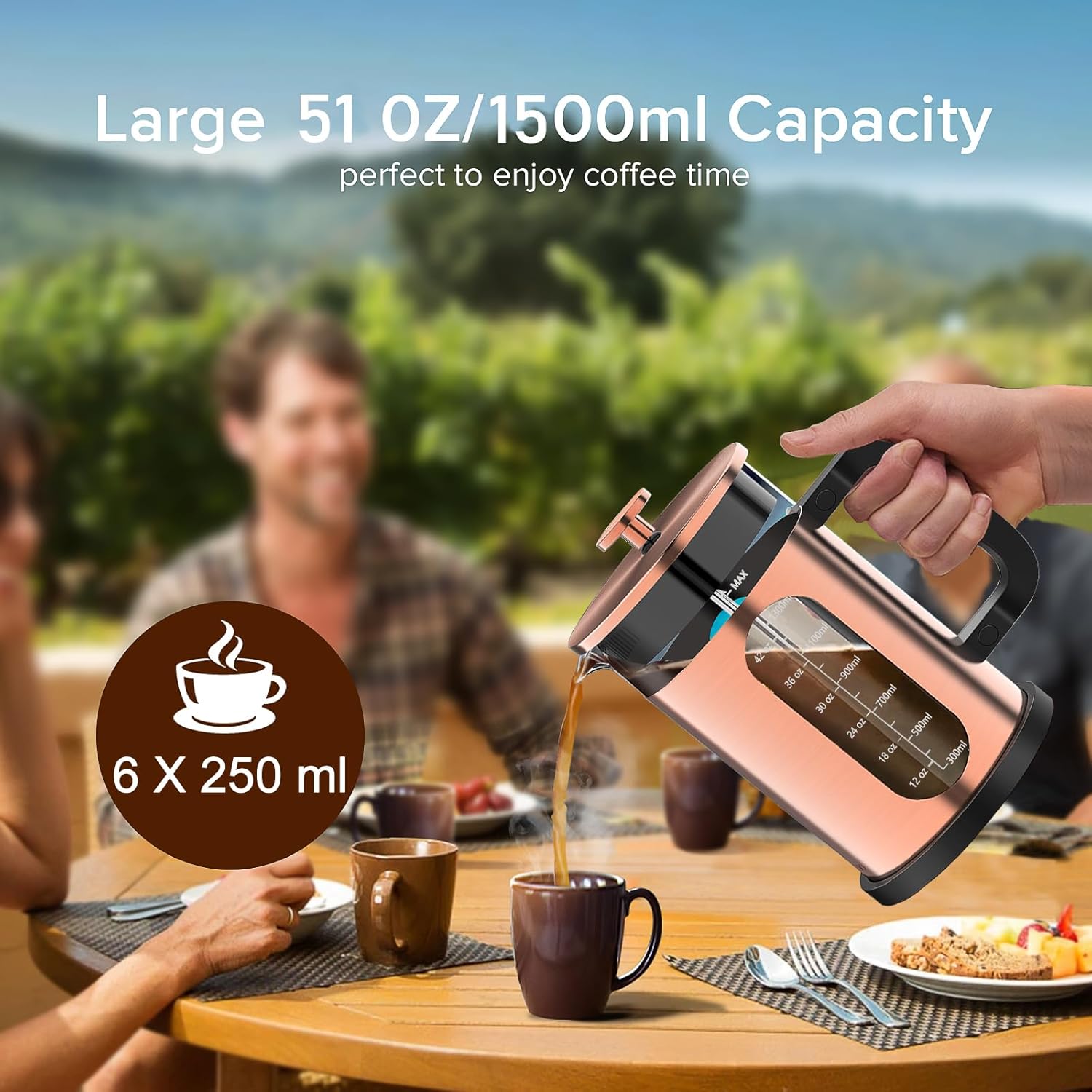 - ăEASY TO USEăBrew a cup of coffee in several minutes. The 51oz/1500ml french press makes the perfect cup of coffee. The french press coffee is the easiest to concentrate on the condition of the beans among the many devices. You can see the amount of foam (crema) after the coffee touches the water, and how the coffee floats on the water and slowly sinks