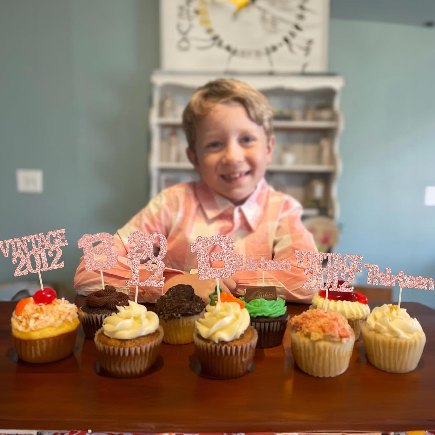 Gyufise 24Pcs 13th Birthday Cupcake Toppers Glitter Thirteen Vintage 2012 Hello 13 Years Birthday Cupcake Picks Official Teenager 13 Cake Decor for Happy 13th Anniversary Party Rose Gold