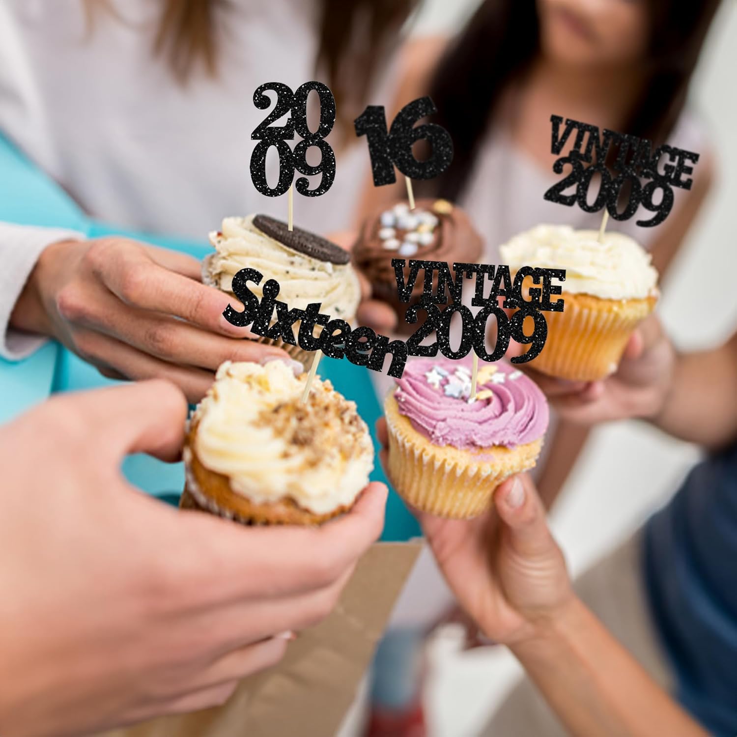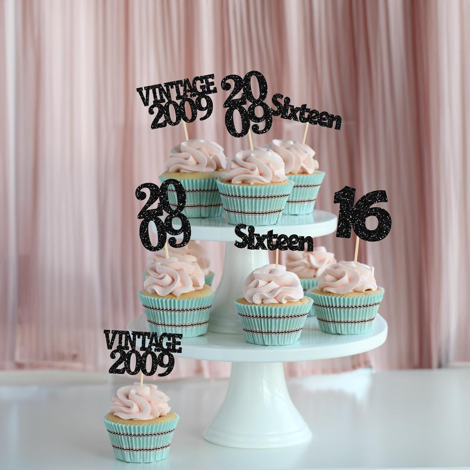 Gyufise 24Pcs 16th Birthday Cupcake Toppers Glitter Sixteen Vintage 2009 Sweet 16 Cupcake Picks Hello 16 Years Birthday Cake Decorations for Happy 16th Birthday Anniversary Party Supplies Black