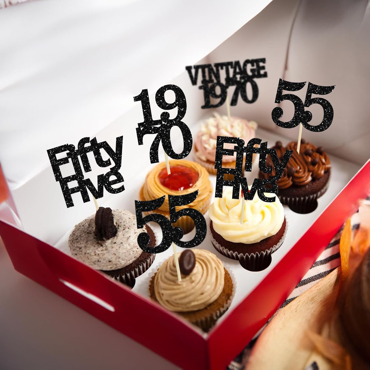 Gyufise 24Pcs Vintage 1970 Cupcake Toppers Glitter Cheers to 55 Fabulous Fifty Five Cupcake Picks 55th Birthday Wedding Anniversary Party Cake Decorations Supplies Black