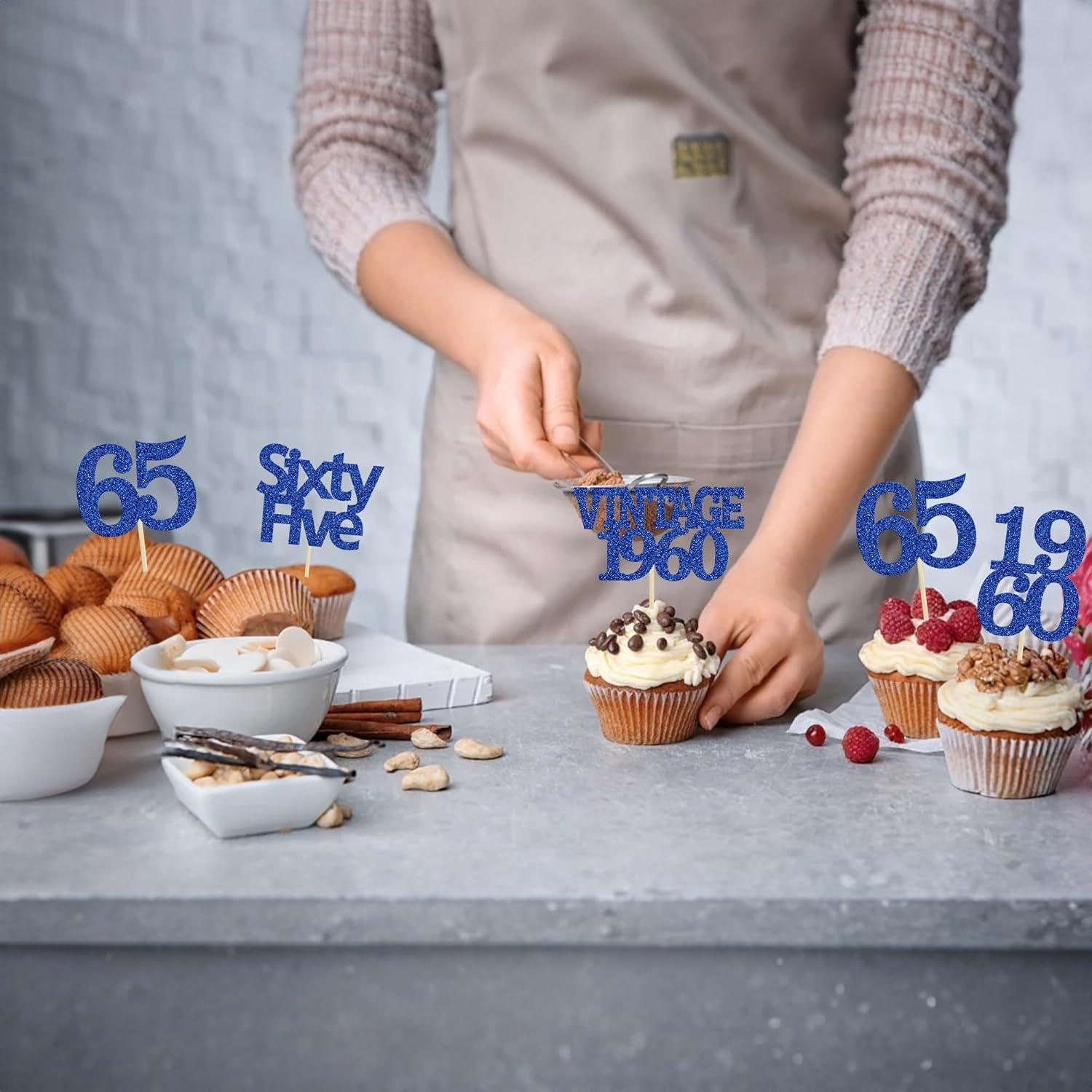 Gyufise 24Pcs Vintage 1960 Cupcake Toppers Glitter Cheers to 65 Fabulous Sixty Five Cupcake Picks 65th Birthday Wedding Anniversary Party Cake Decorations Supplies Deep Blue