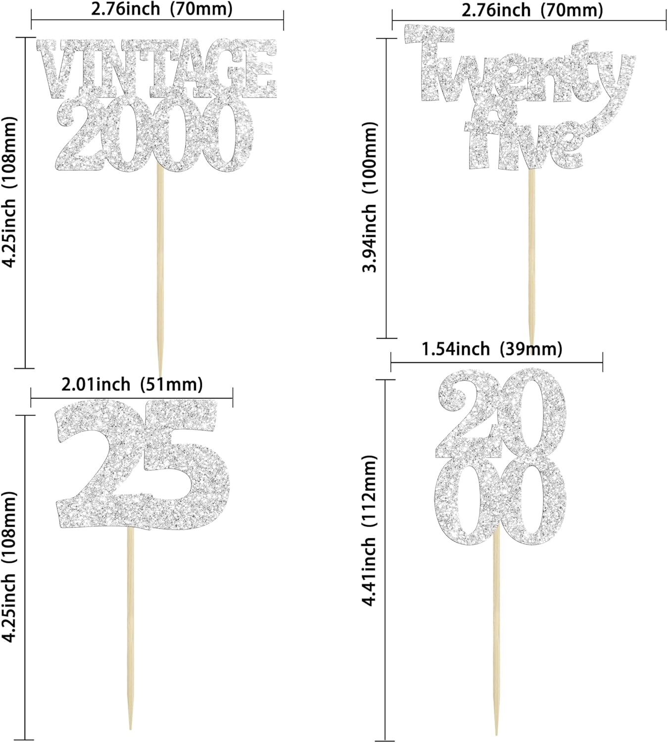 Gyufise 24Pcs 25th Birthday Cupcake Toppers Glitter Twenty-five Vintage 2000 Hello 25 Years Birthday Cupcake Pick Cheers to 25 Cake Decoration for Happy 25th Anniversary Party Supplies Silver