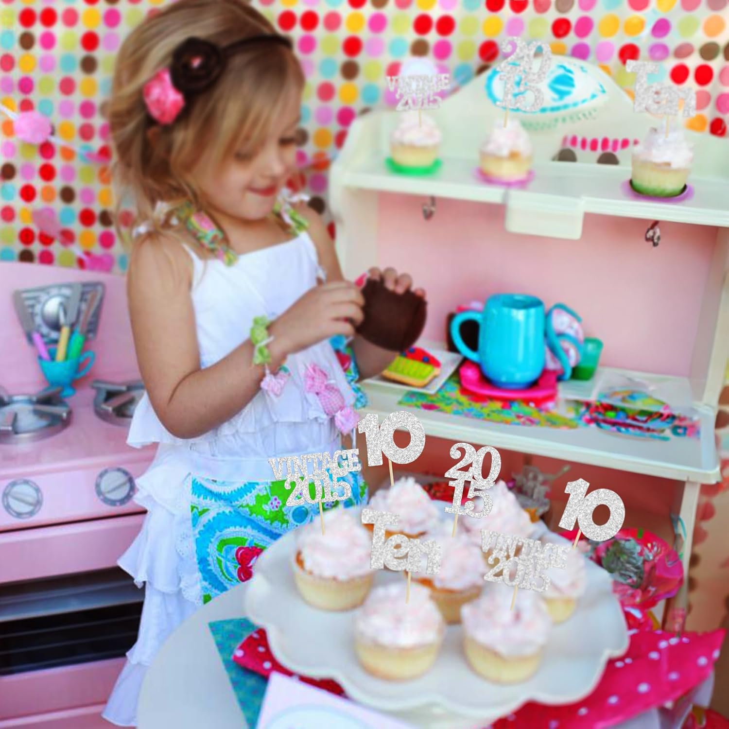 Gyufise 24Pcs 10th Birthday Cupcake Toppers Glitter Ten Vintage 2015 Hello 10 Years Birthday 10 Cupcake Picks Double Digits Cake Decorations for Happy 10th Birthday Anniversary Party Supplies Silver