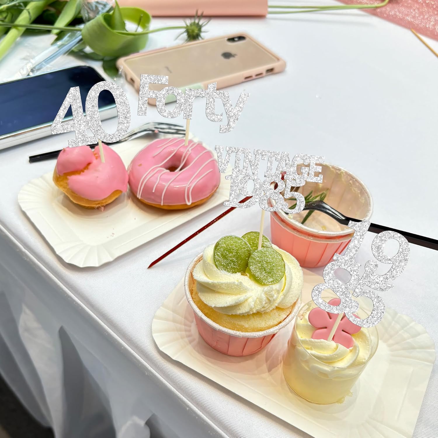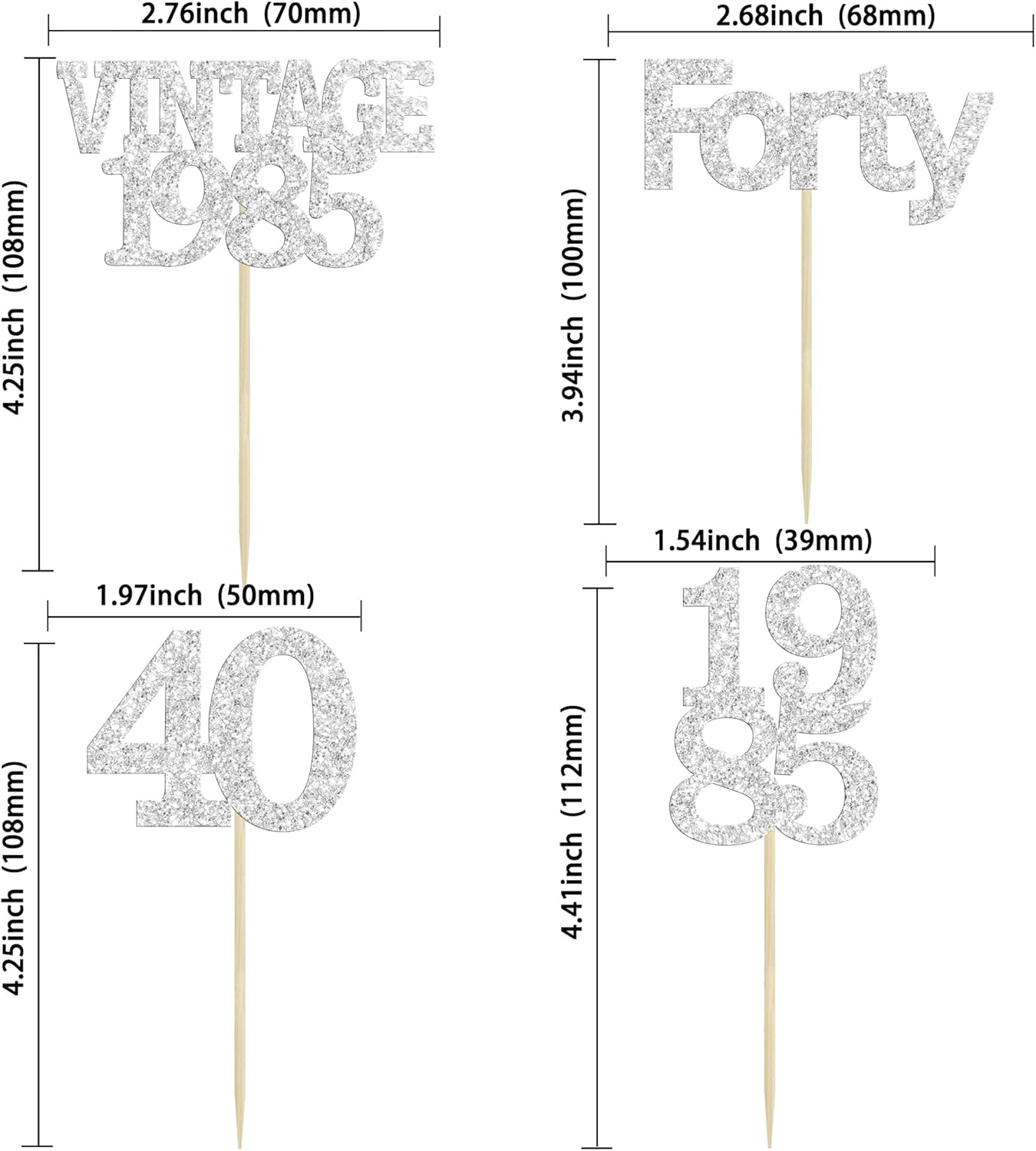 Gyufise 24Pcs Happy 40th Birthday Cupcake Toppers Glitter Forty 40 Fabulous Vintage 1985 Cake Toppers for 40th Birthday Wedding Anniversary Party Cake Decorations Supplies Silver