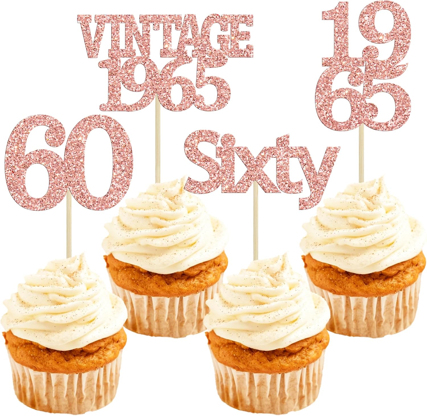 Gyufise 24Pcs 60th Birthday Cupcake Toppers Cheers to 60 Fabulous Sixty Cupcake Picks Vintage 1965 Decorations for 60th Birthday Wedding Anniversary Party Cake Decorations Supplies Rose Gold