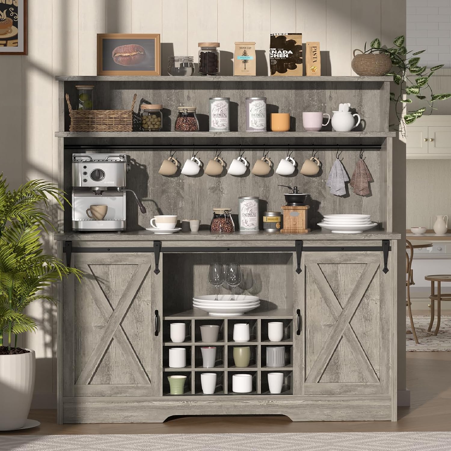 - [Easy to Assemble&Clean]: Assembly is quick with detailed instructions. Giving your setup a clean, organized look and the farmhouse bar cabinet with hutch is so easy to clean. This coffee bar's layout ensures everything is within easy reach.