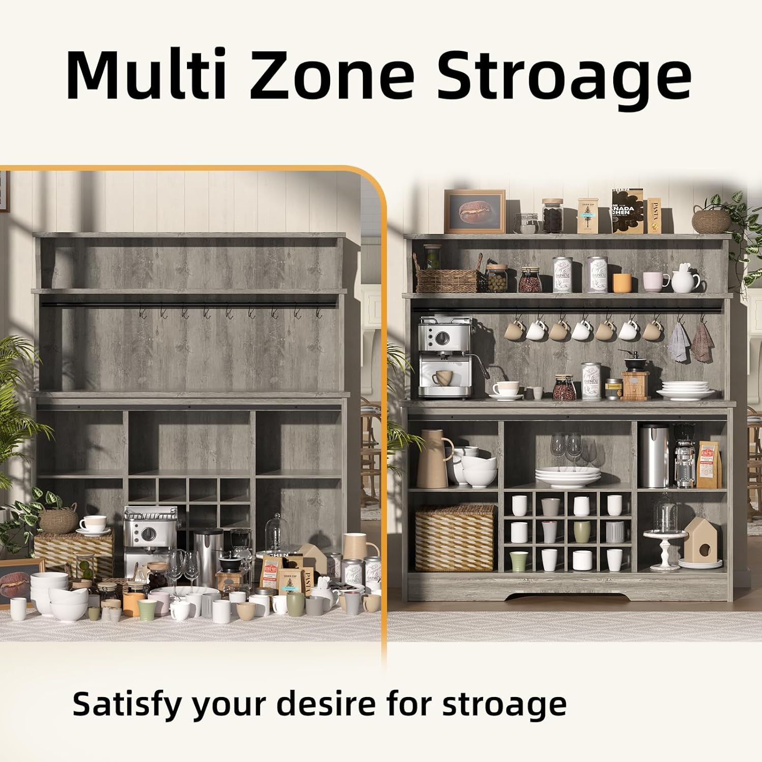 - [Multifunctional Use]: This coffee station allows you to stylishly display and store your coffee mugs and stemware. It also can serve as a wine bar cabinet, coffee bar, home bar, sideboard, TV bar, and more. It is an ideal coffee bar for kitchen, living room, dining room and office.
