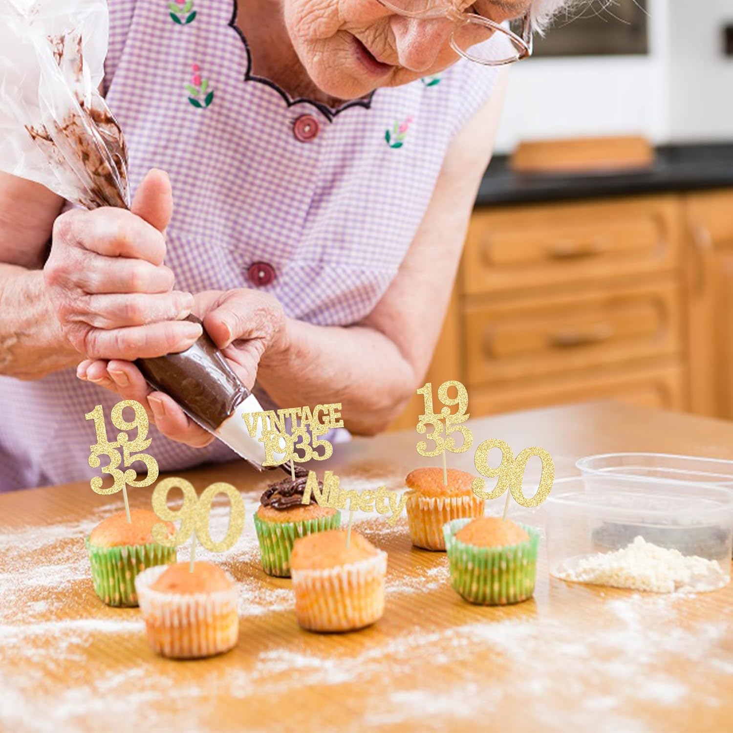Gyufise 24Pcs 90th Birthday Cupcake Toppers Glitter Cheers to 90 Fabulous Ninety Vintage 1935 Cupcake Picks 90th Birthday Wedding Anniversary Party Cake Decorations Supplies Gold