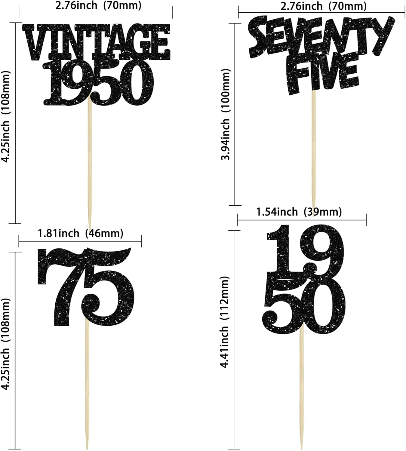 Gyufise 24Pcs Vintage 1950 Cupcake Toppers Glitter Cheers to 75 Fabulous Seventy Five Cupcake Picks 75th Birthday Wedding Anniversary Party Cake Decorations Supplies Black