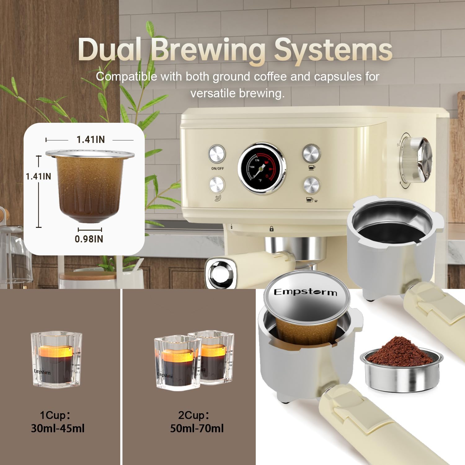 - âă2 in 1 Extractionă- This espresso coffee machine comes with two Portafilters that can be used for coffee powder and capsule coffee. Cup warmer on top to preheat cups for longer heat retention. Attention: Not compatible with all capsule sizes and does not include capsules.
