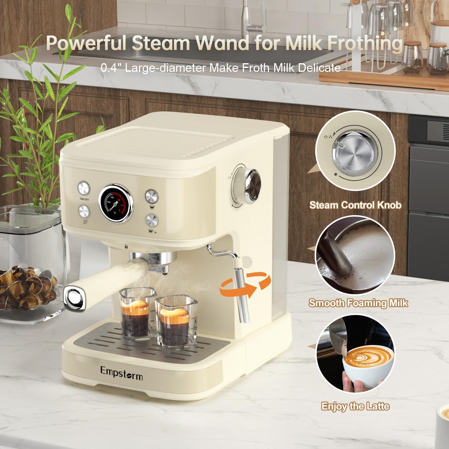 - đ„ăSteam Wandă- 360° adjustable steam wand creates smooth, creamy froth for lattes/cappuccinos in â€60s at home or in the office. Removable nozzle for easy cleaning. With thermometer dial for easy viewing.