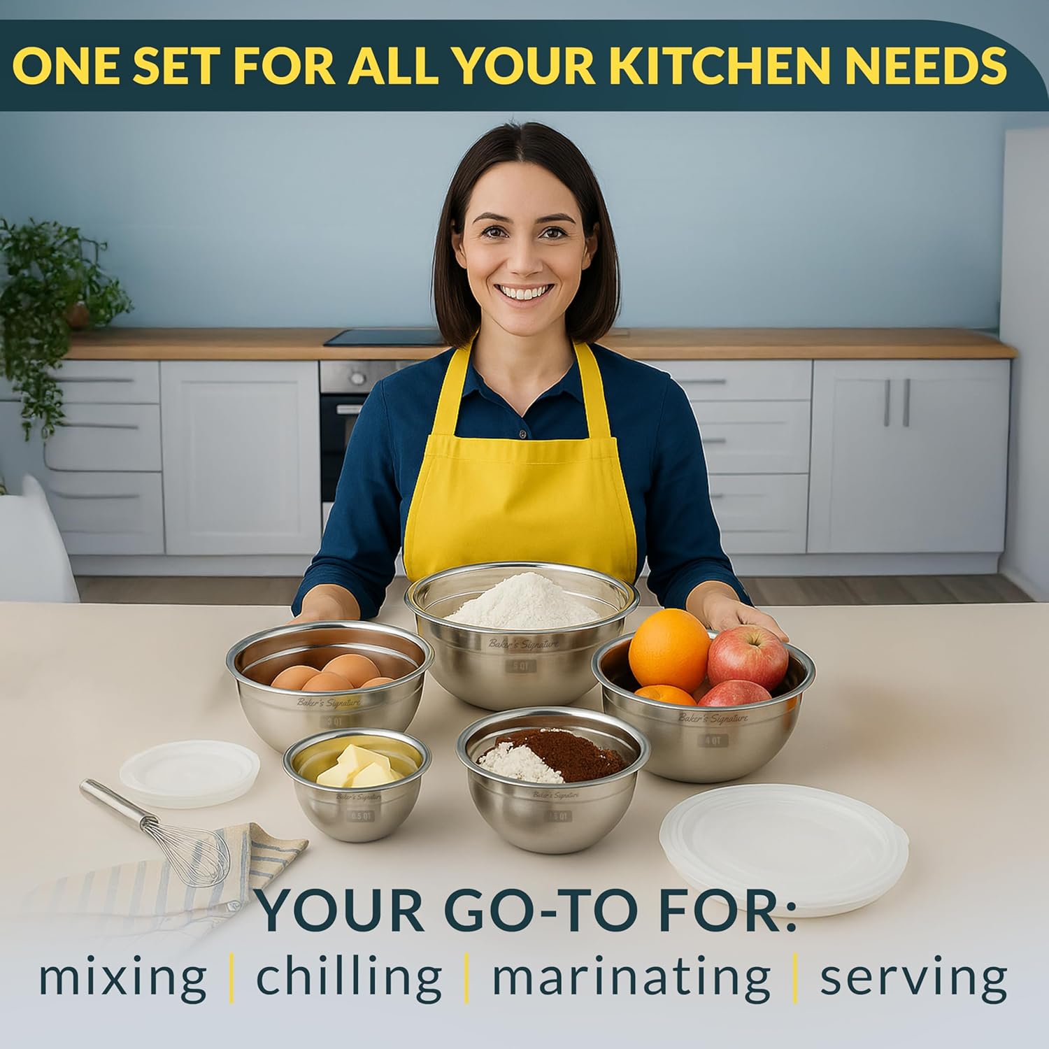 - DURABLE & LIGHTWEIGHT: Strong enough for daily use yet light enough to handle easily, this mixing bowl set features stainless steel bowl lid protection and is dishwasher safe (except lids).