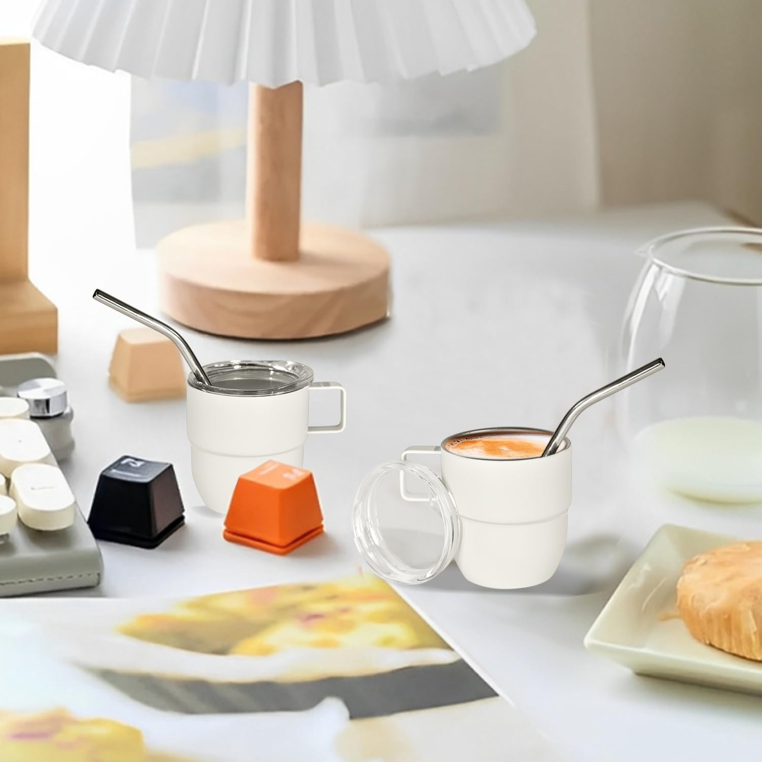 4oz Stackable Cup, Vacuum Insulated Espresso Cup Set of 2, Espresso Mug for Coffee, Double Wall Stainless Steel Mini Tumbler Shot Glasses with Straw and Lid (B-white2P, 4oz)