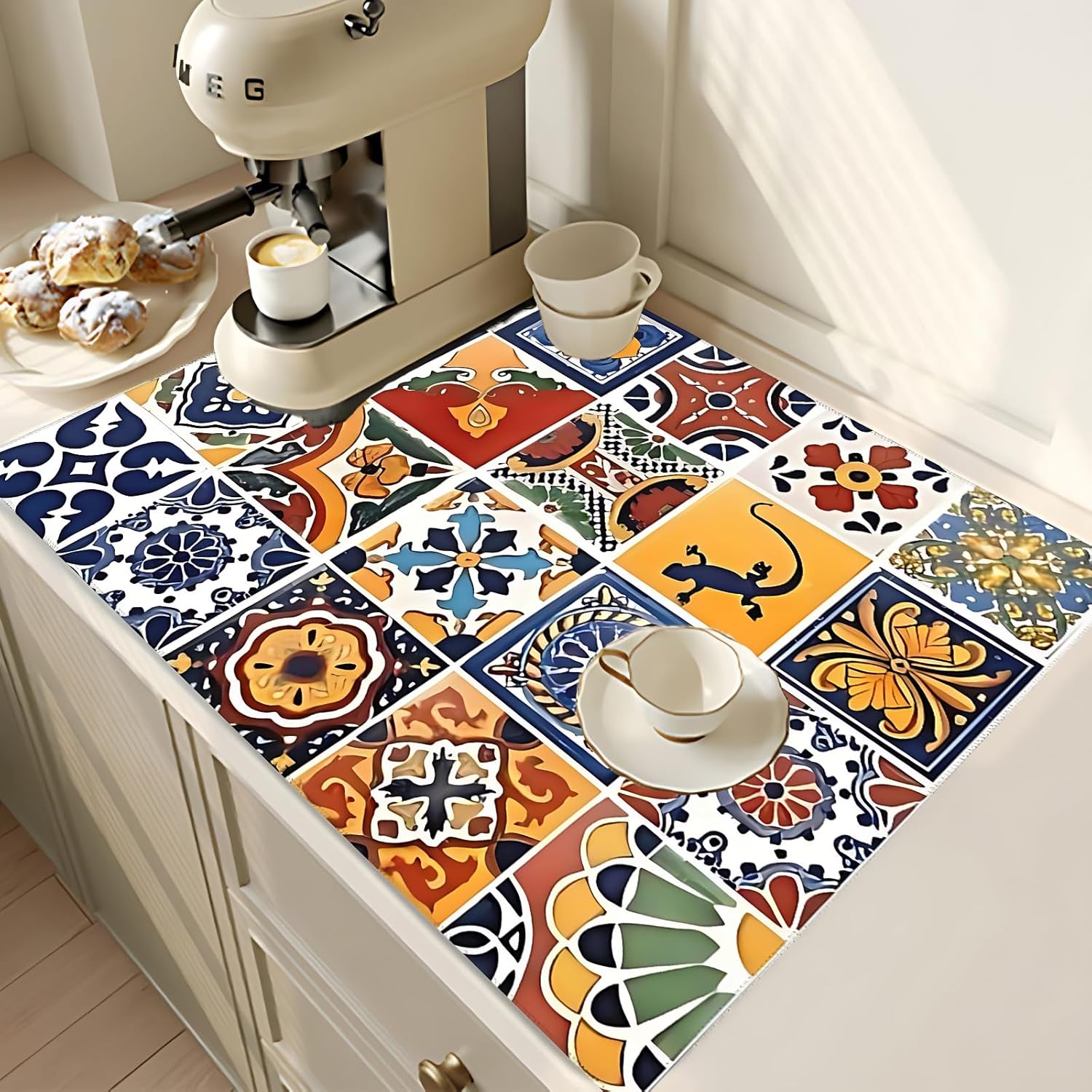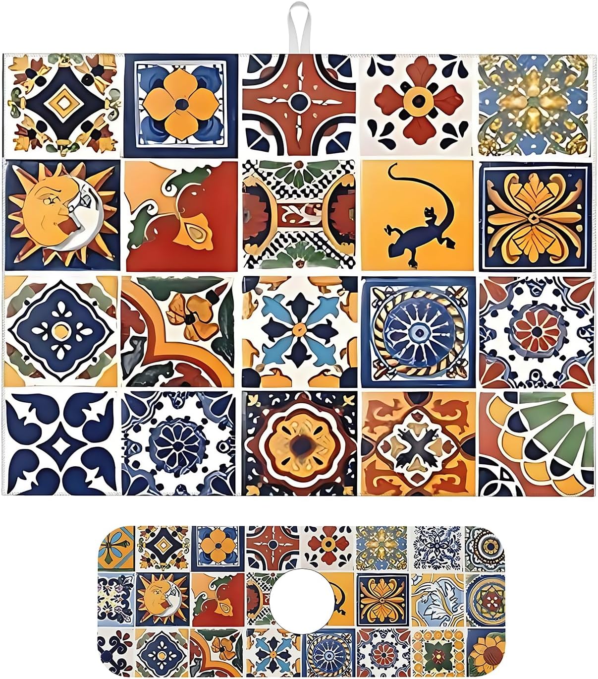 2Pcs Dish Drying Mats Faucet Mats Sets Large Size Coffee Mats Sink Faucet Mat Splash Guard for Kitchen Counter Bathroom Sink Coffee Bar Kitchen Decor (Retro Boho, 18"x24" 15" x 5.5"Set)