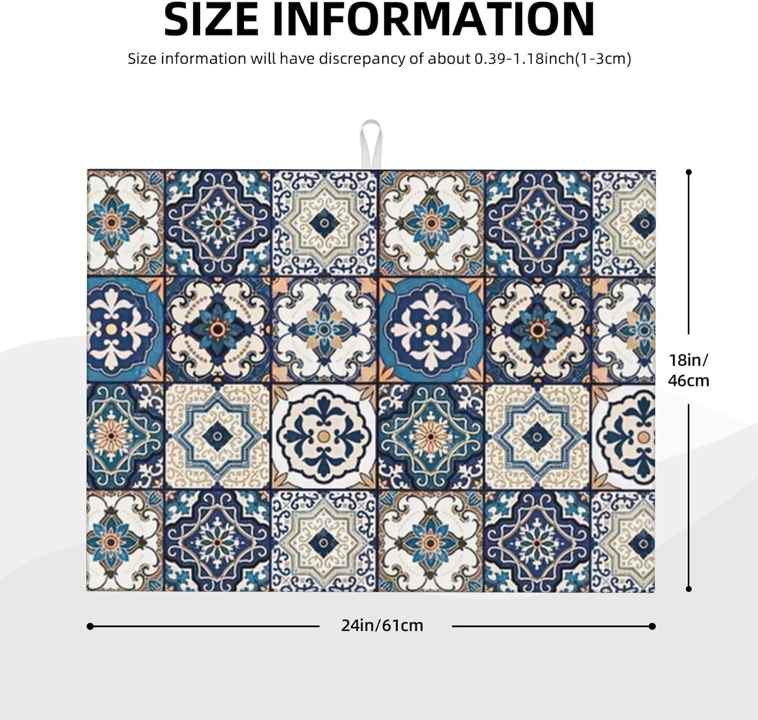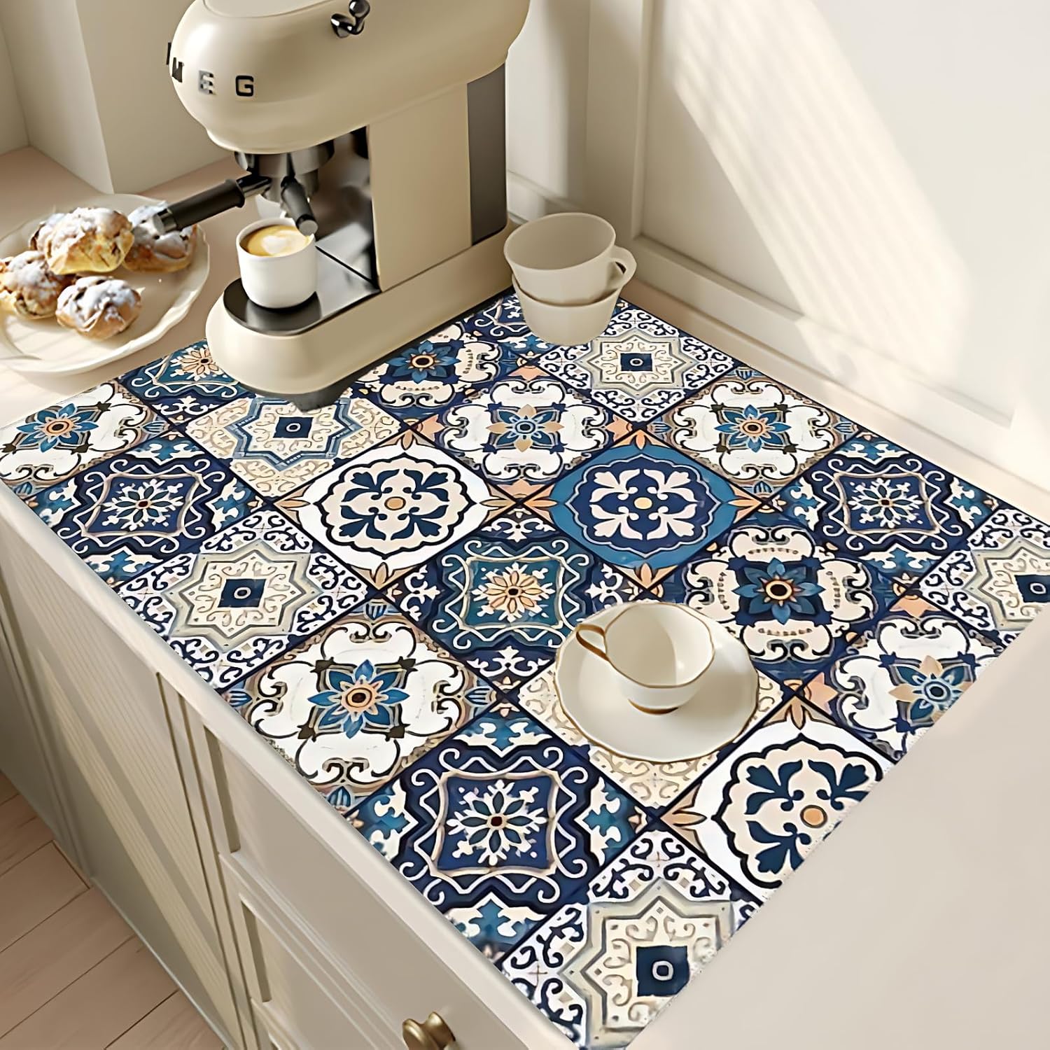 2Pcs Dish Drying Mats Faucet Mats Sets Large Size Coffee Mats Sink Faucet Mat Splash Guard for Kitchen Counter Bathroom Sink Coffee Bar Kitchen Decor (Blue Boho, 18"x24" 15" x 5.5"Set)