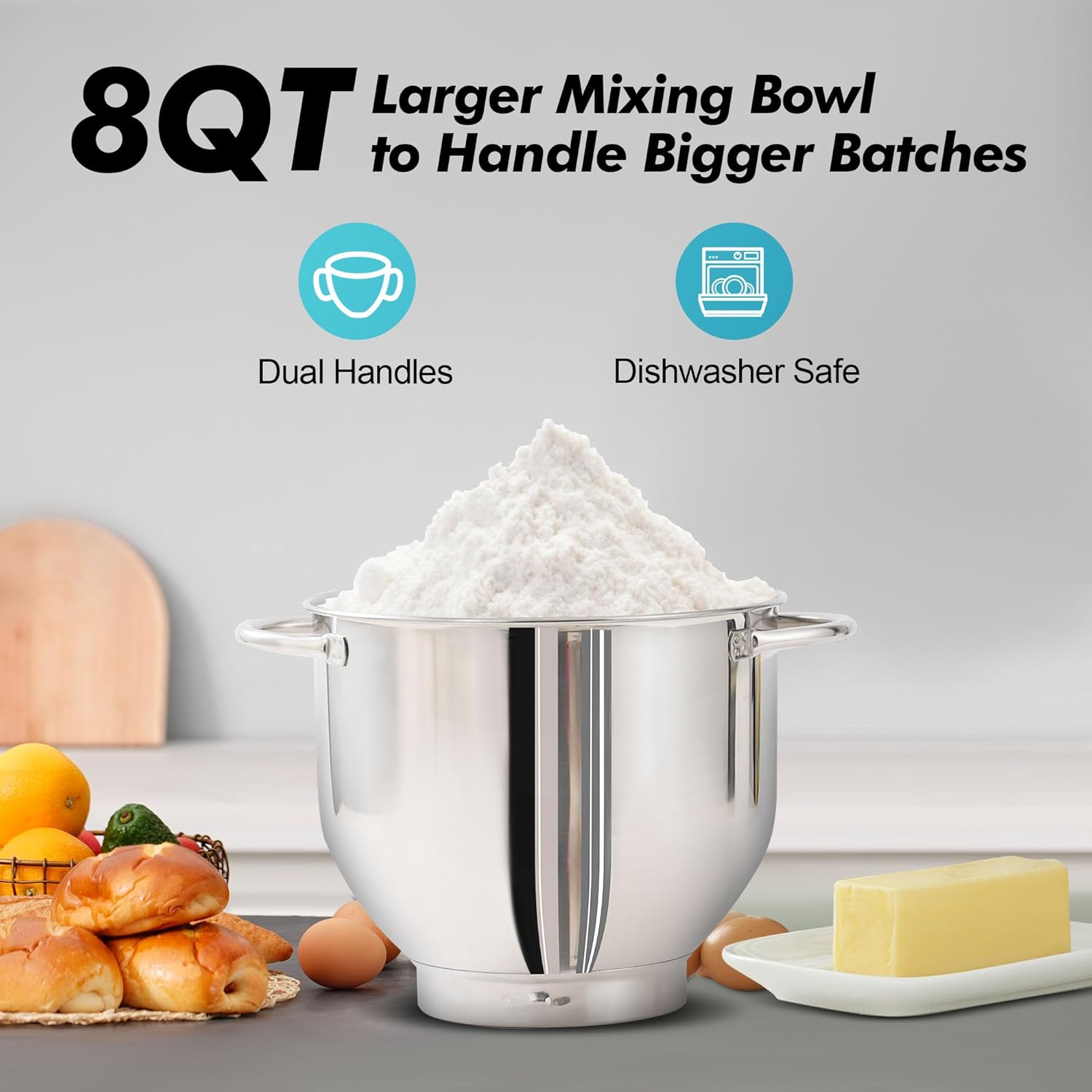- 8QT Large Capacity Bowl With Handles - 8QT Stainless steel bowl can meet all your kitchen needs. The Stand Mixer is easy to use for making cakes, breads, cookies, pastry, muffins and waffle, and the dual handles are more convenient to hold.