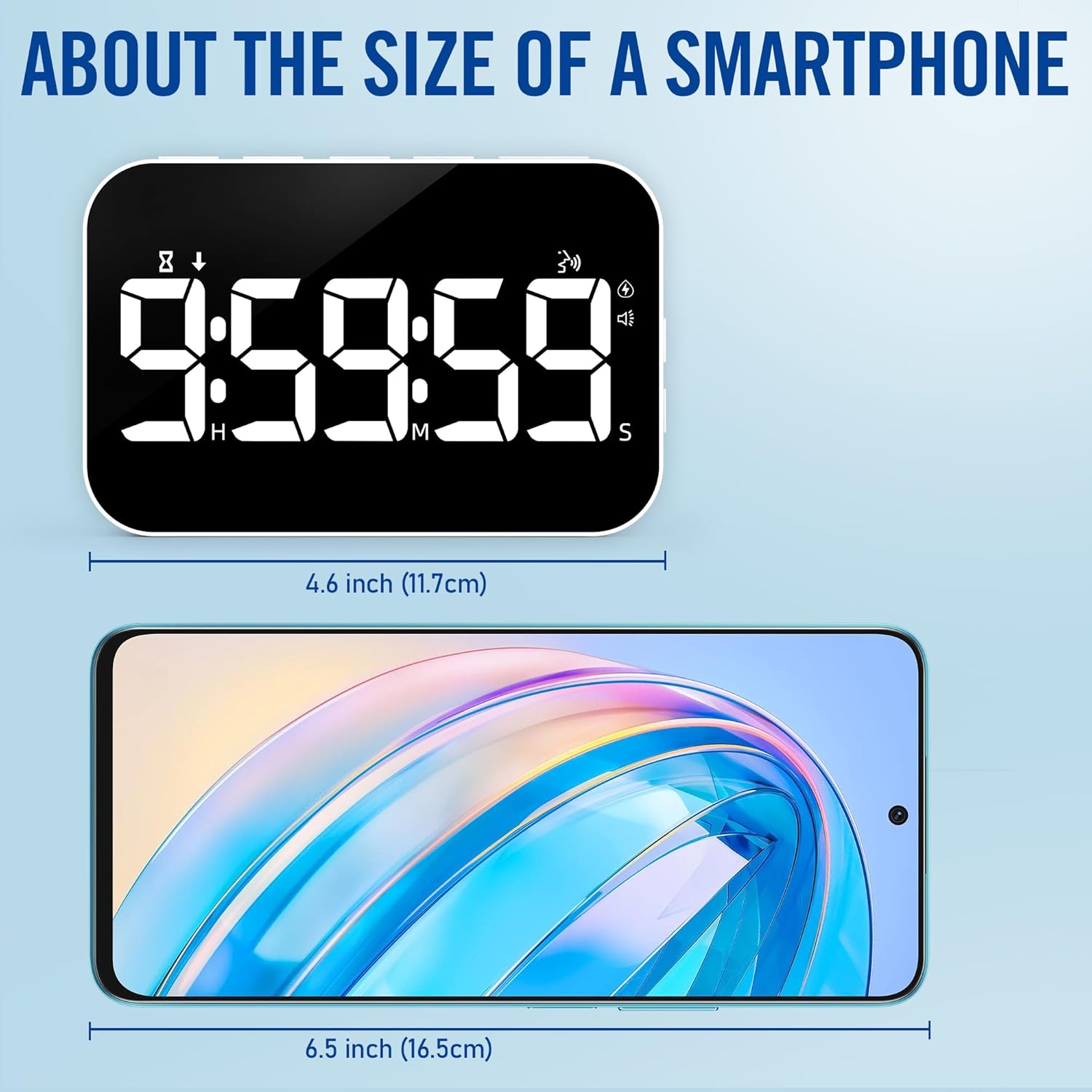 - Rechargeble Large LED Display Timer: No need for additional batteries, built-in battery supports Type C charging(Charging cable included in the package). 5" LED screen and red digital display can work for at least 5 hours in Hight Light Mode. When the battery is low, there is a low battery indicator in the upper left corner.