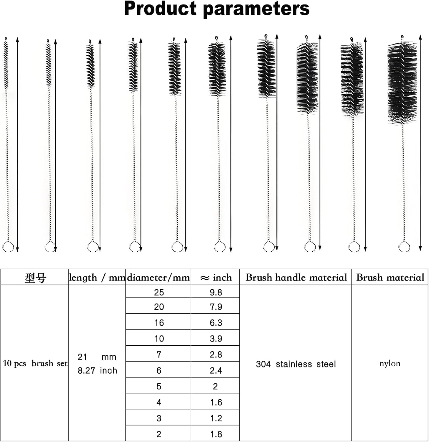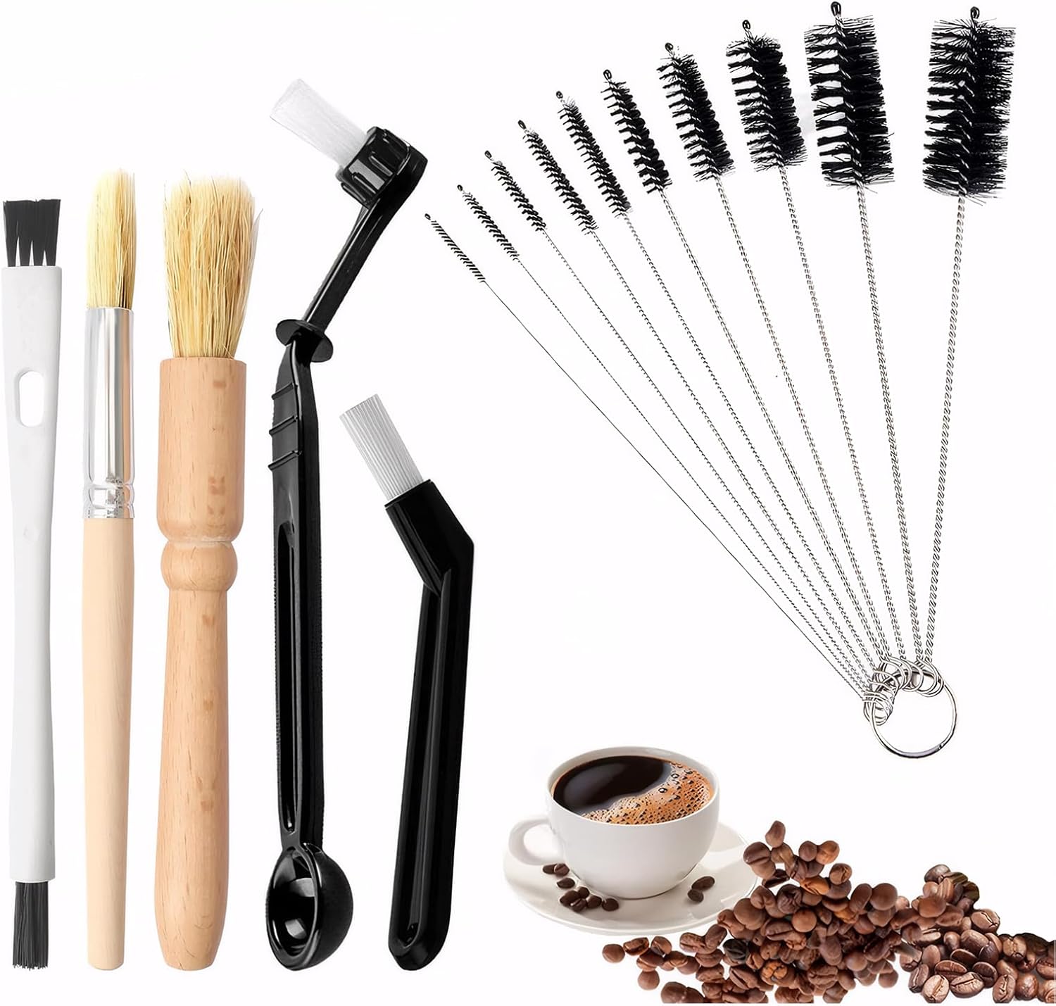 - Cleaning kit: includes 3 plastic nylon brushes, 2 wooden coffee brushes, 10 bendable stainless steel long handled brushes, size reference picture