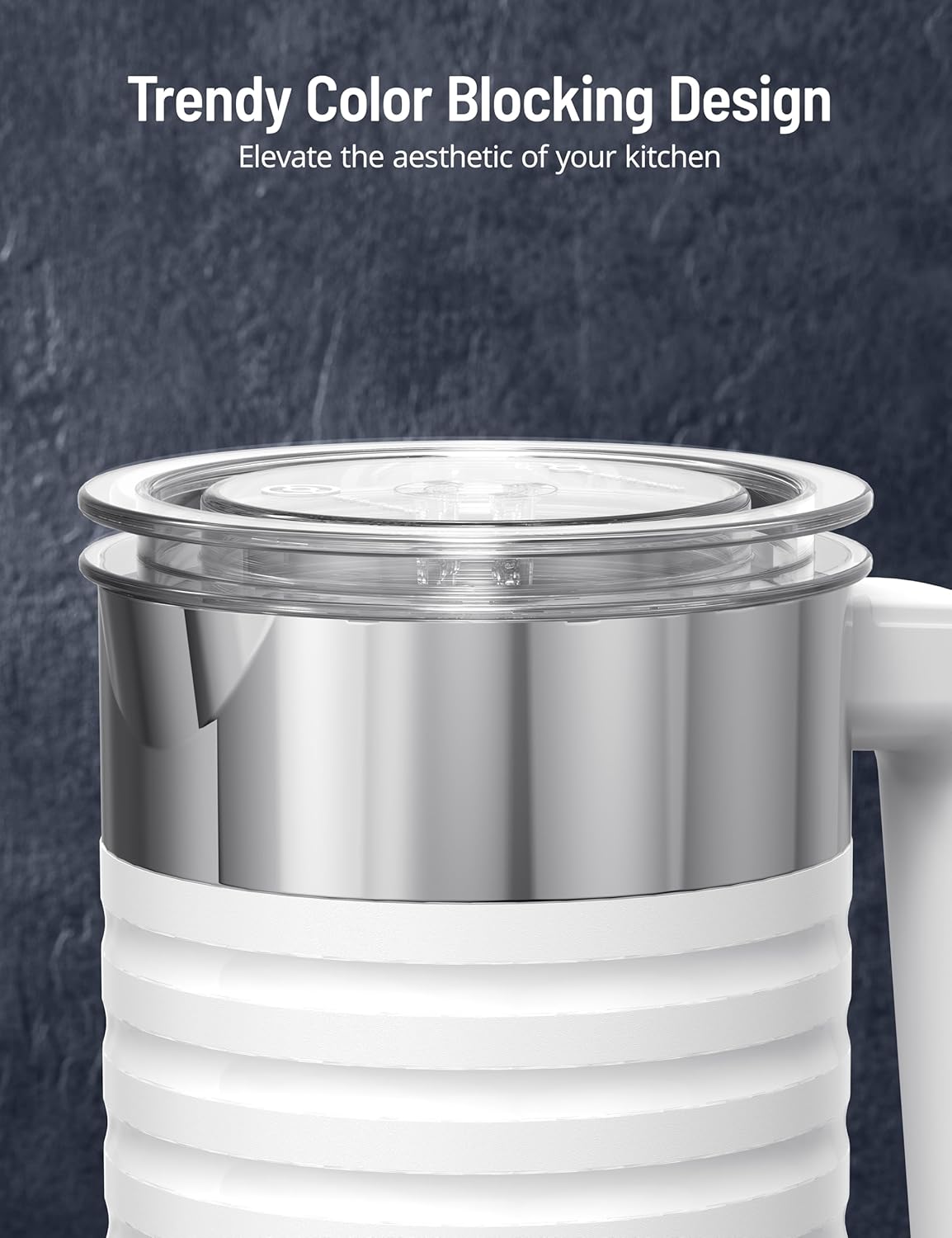 - 【4-in-1 Multifunctionality】: This electric milk frother is equipped with 4 in 1 functions including hot dense foam, hot air foam, heated milk and cold foam, allowing you to DIY velvety smooth coffee, hot chocolate maker or milk tea maker. It can also heat milk up to 70°C / 158°F.