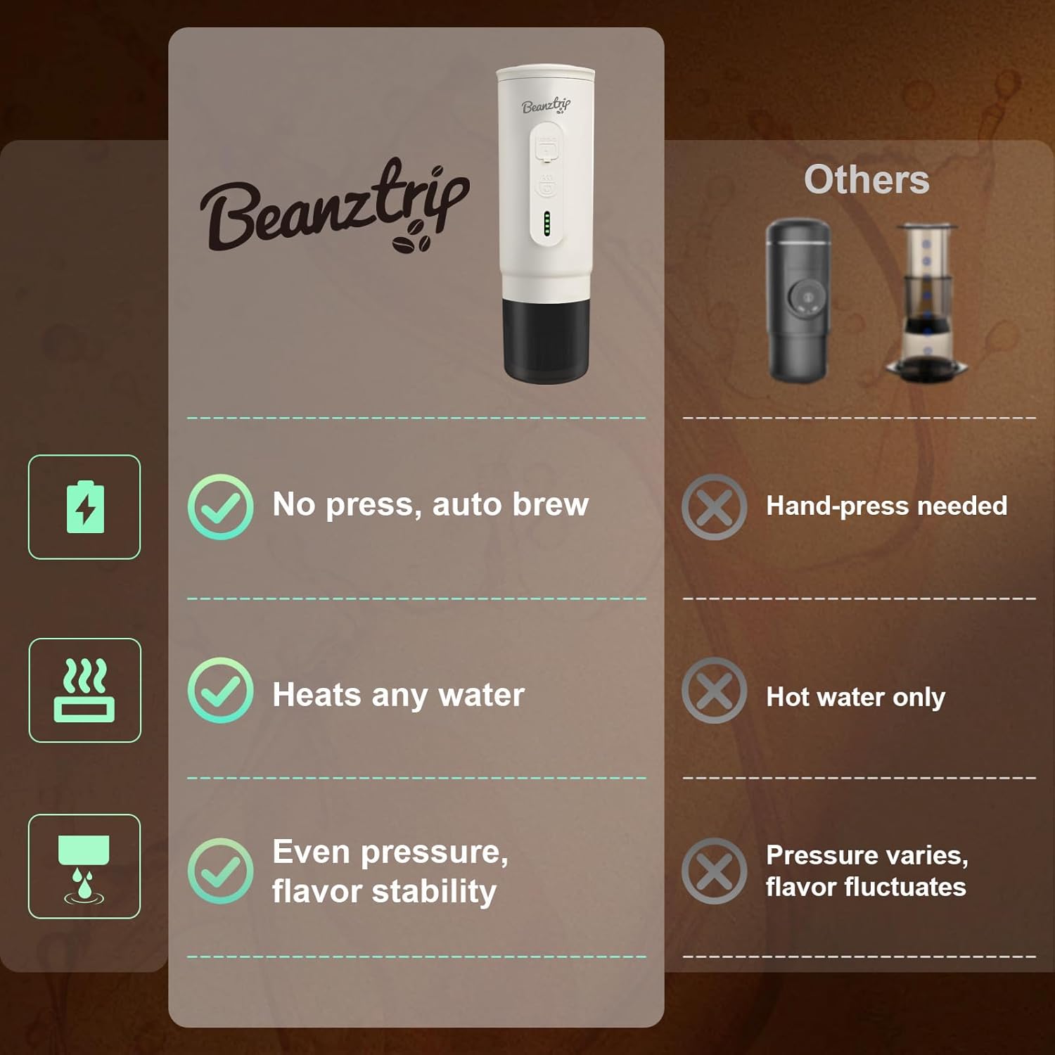 - Leak-Proof & More Durable: Beanztrip portable espresso machine features the food-grade PC & ABS shell and seamless stainless steel water tank (precision stamped, not welded) for a better seal than welded tanks and superior leak-proof performance, quality craftsmanship ensures coffee maker durability and zero leakage!