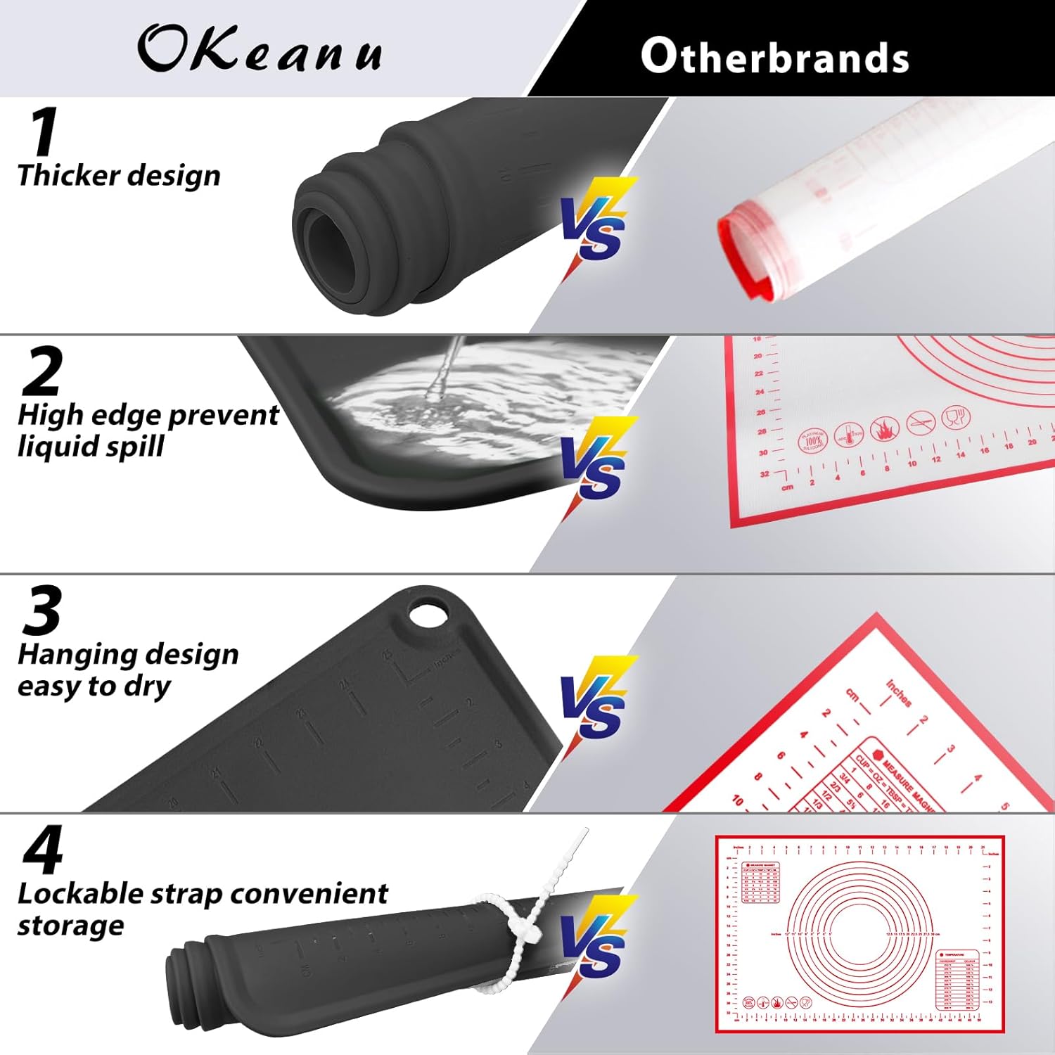 - DOUBLE THICKNESS & DURABLE MAT: The thickness silicone rolling mat is 2 mm and edge hightness is 5 mm. The unique raised edge design can prevent the water from spilling out when you knead the dough, keep your desk clean.