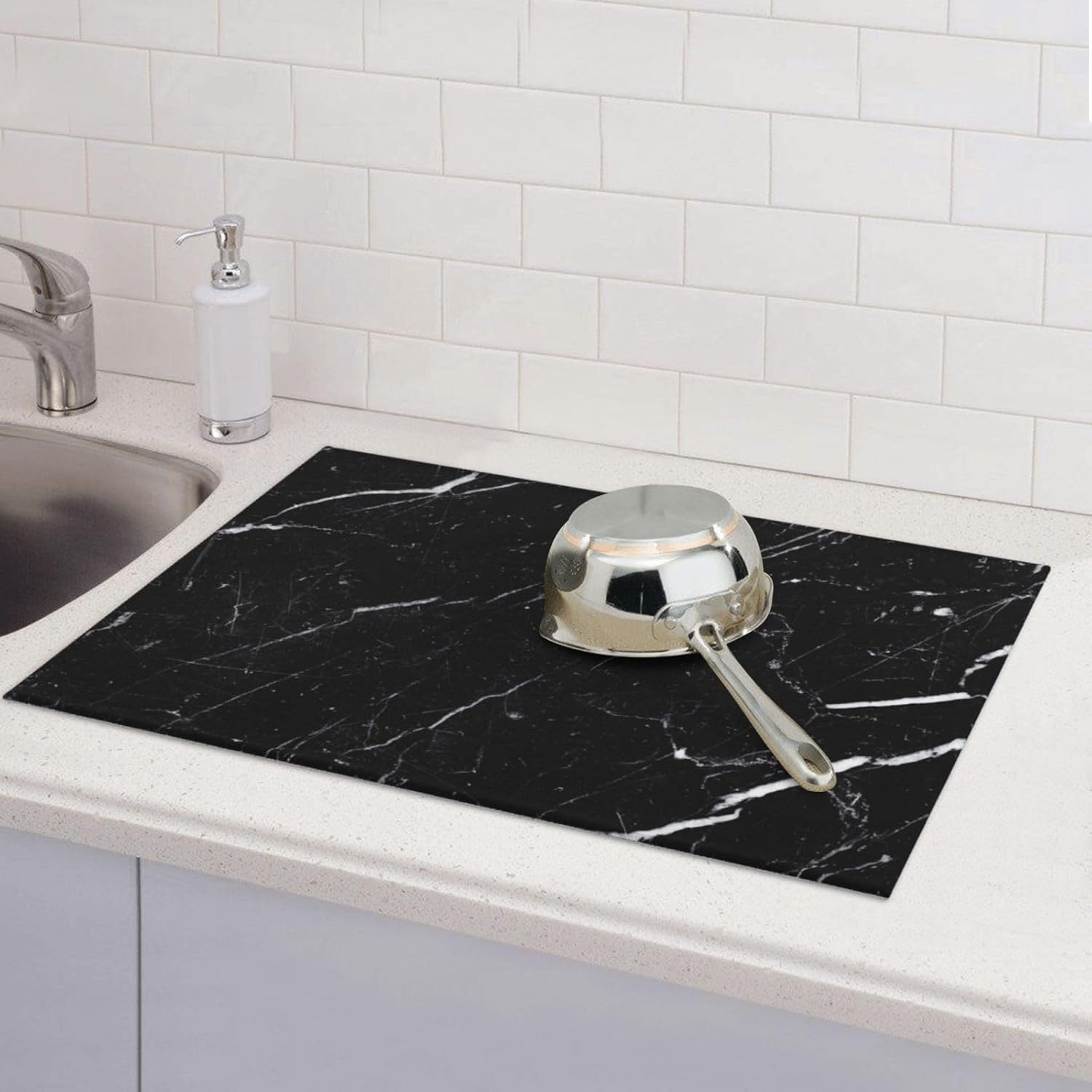 Dish Drying Mat Coffee Bar Mat for Kitchen Counter, Absorbent Dish Rack Pad Hide Stain Coffee Accessories Large Dish Drying Pad, Black Marble 18"x24"
