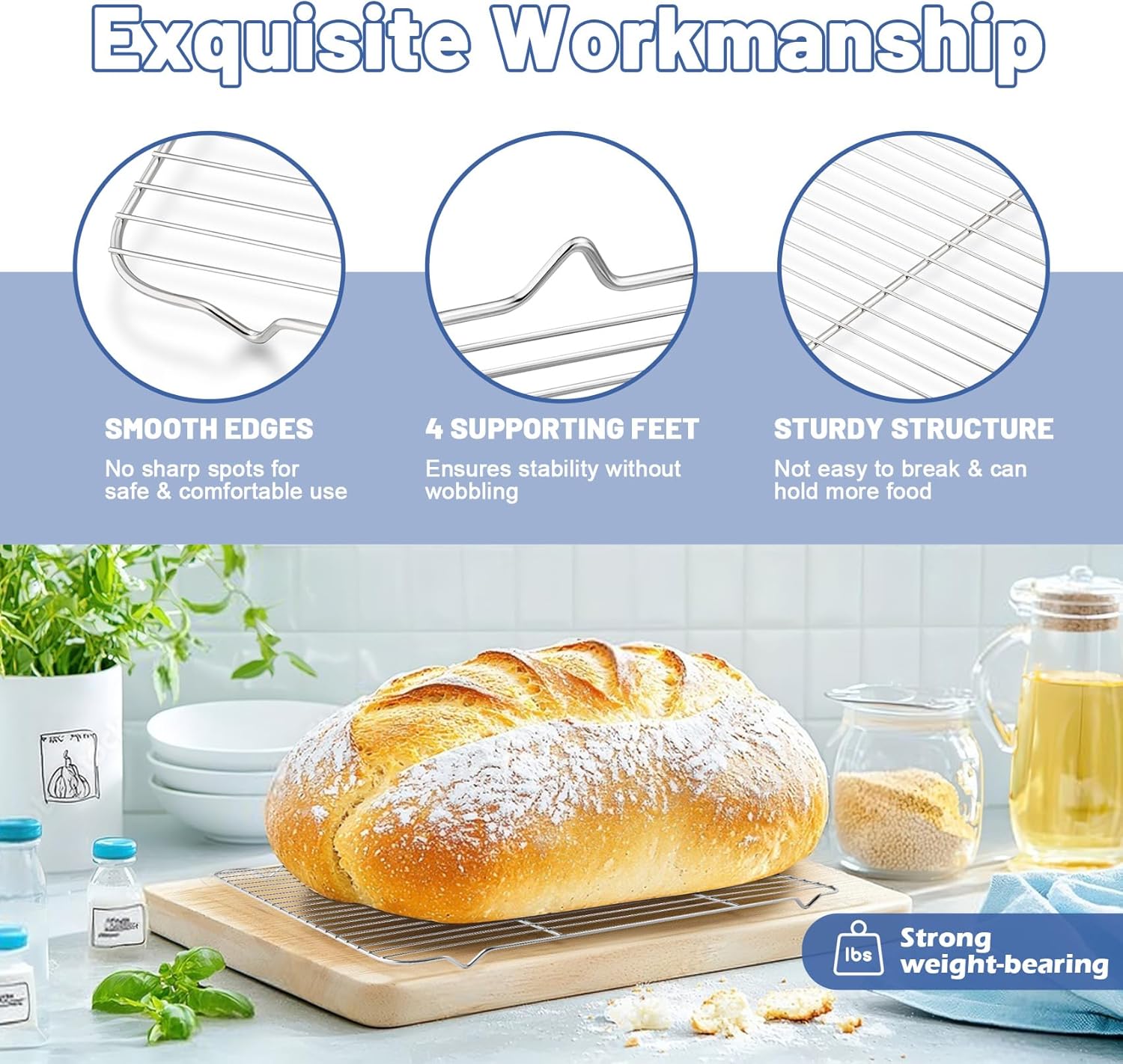 - STURDY & HOLD MORE FOOD: Thick solid wires are firmly welded together to ensure this baking rack won't break easily and strengthen load-bearing capacity, 4 raised feet with 2 crossbars enhance stability and won't wobble, Rust and corrosion resistant, Heavy-duty construction prolongs the roasting rack service life, a great replacement to other racks