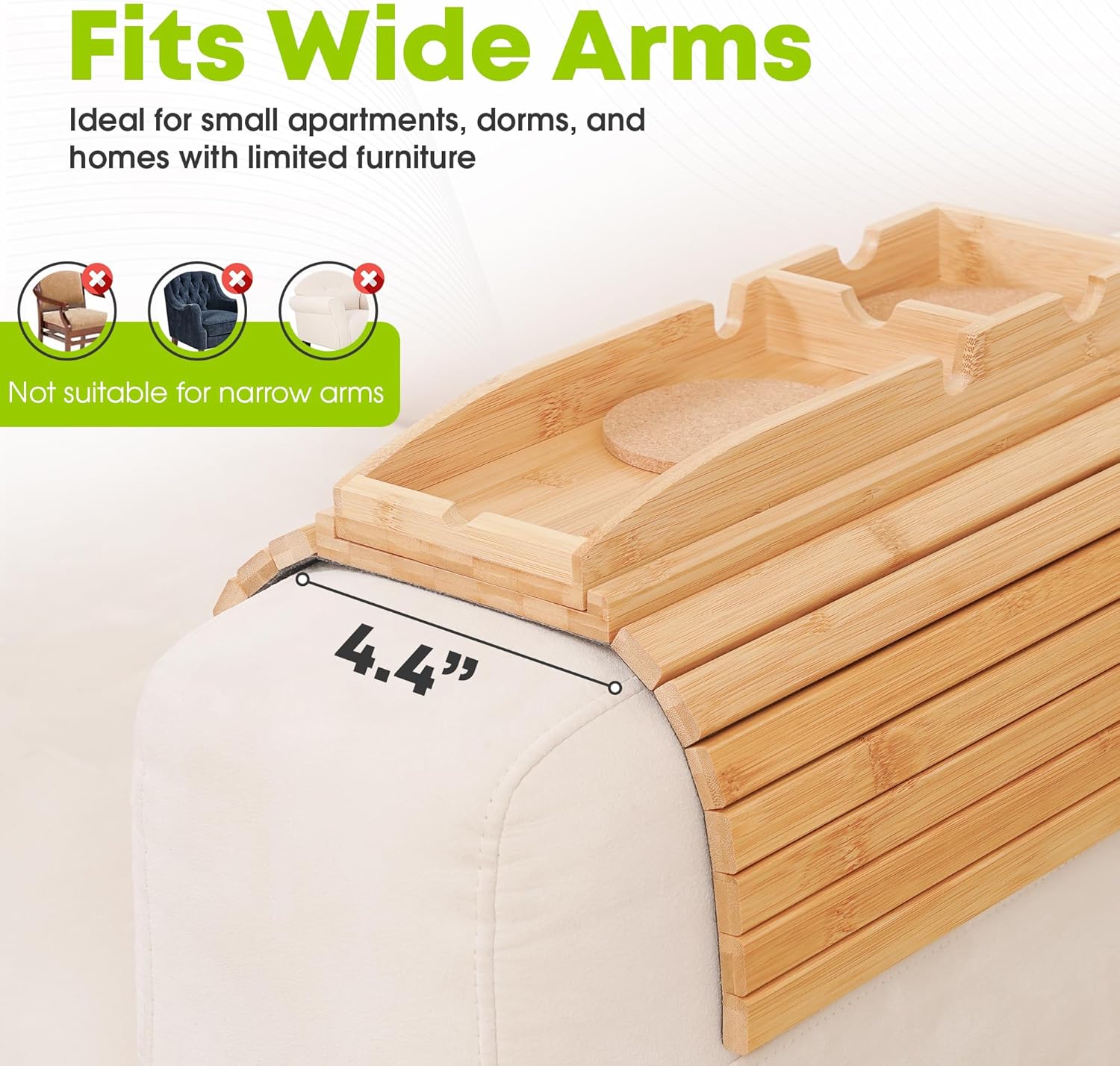 Foldable Couch Cup Holder with 2 Cork Coasters – Detachable Bamboo Sofa Tray, Anti-Slip Sofa Armrest Caddy for Drinks, Snacks, Laptops, & Bathtub – Perfect Home & Gift Accessory