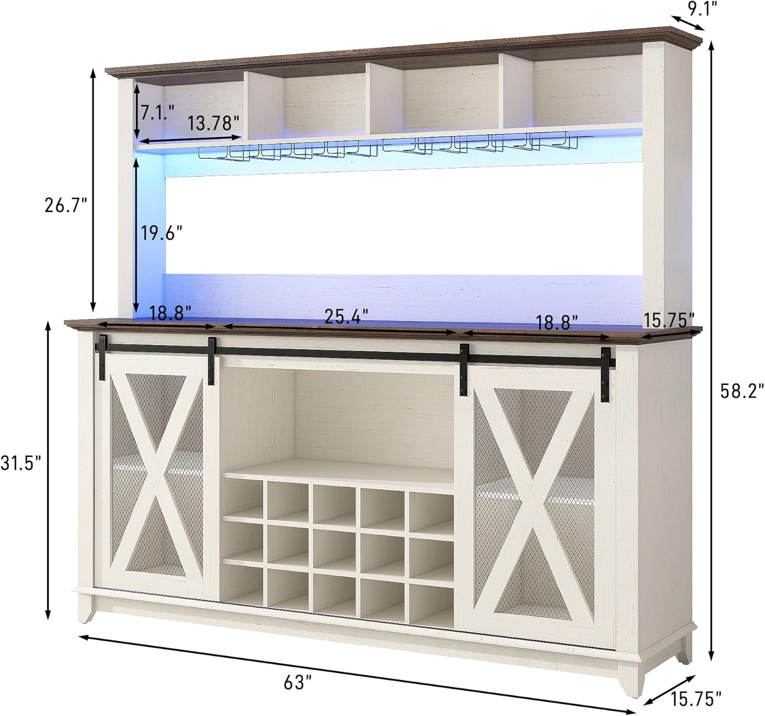 - Coffee Bar Cabinet With LED Lights:this 63"W farmhouse coffee bar cabinet Equipped with an RGB LED light strip,by Mobile APP and Remote control to control LED lights.the light strip that can adjust 60,000 RGB colors, with color, brightness, and mode adjustment functions, music synchronization function, and timing function.which is perfect for wine tasting, parties, and showcasing wine collection.