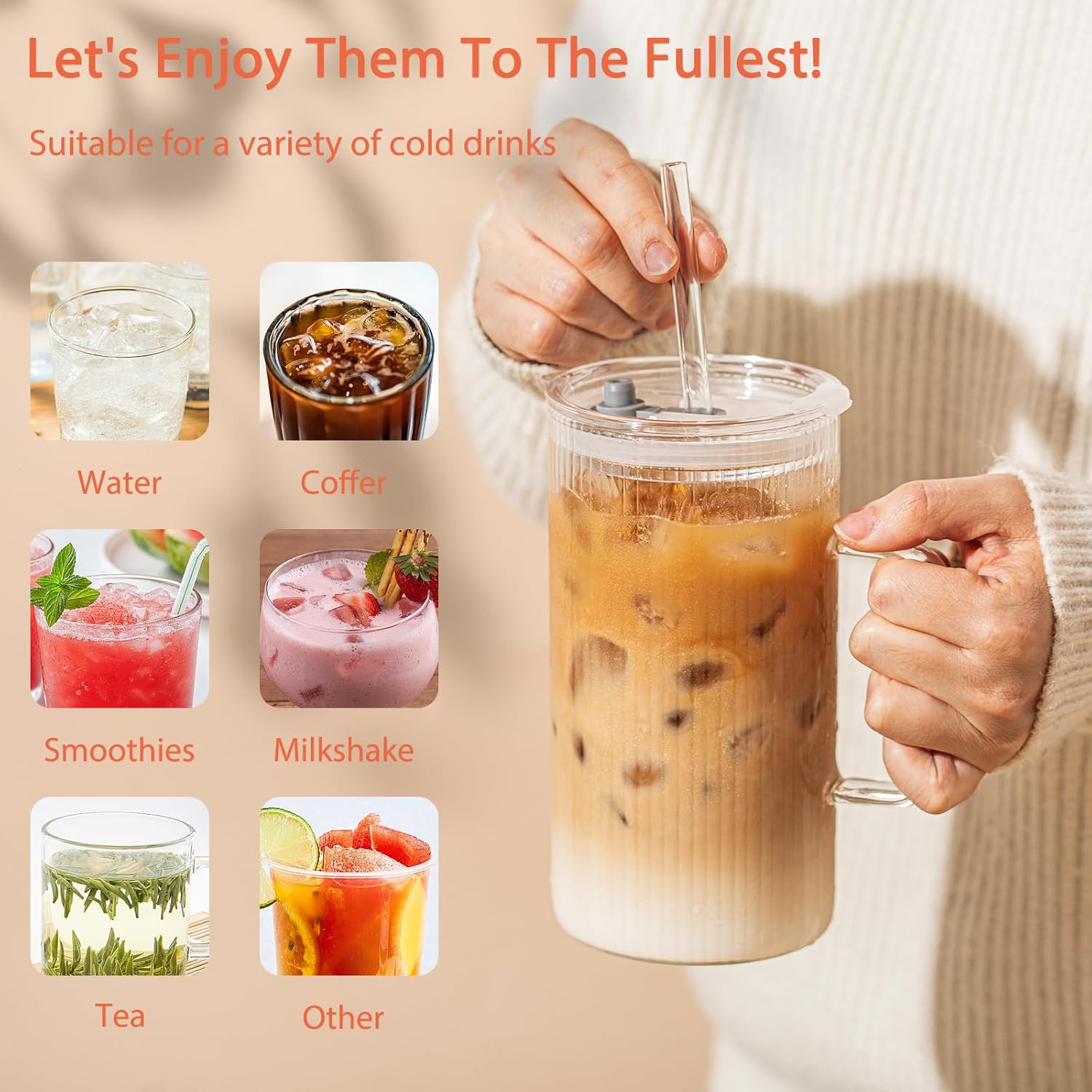 26oz Large Ribbed Glass Tumbler with Handle and Lid - Set of 2, Clear Glass Cups with Reusable Straws, Vertical Striped Design - Perfect for Iced Coffee, Tea, Smoothies, and Cocktails