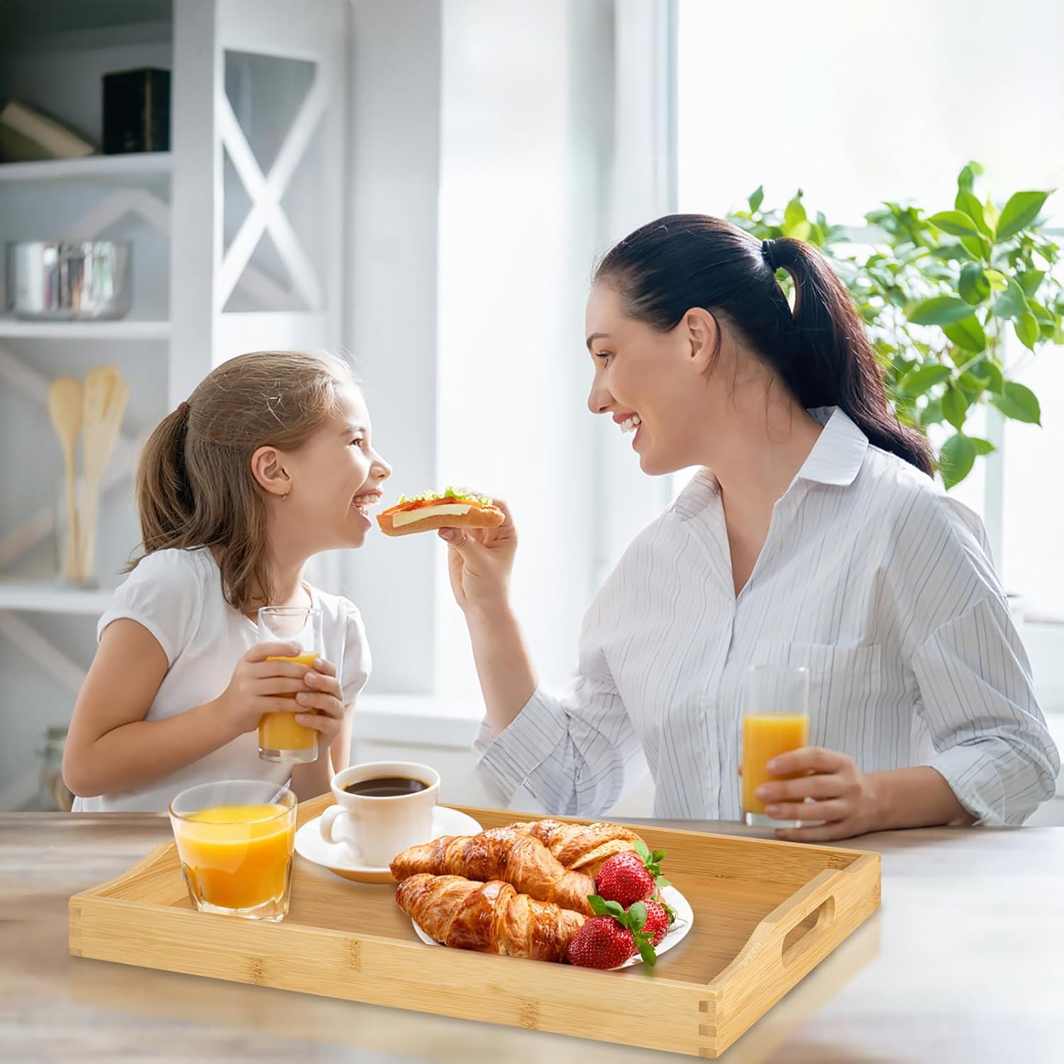 Bamboo Food Serving Tray with Handles, Breakfast Bed Tray for Tea,Snack,Dinner, Home Decorative Storage Food, Platter, Ottoman for Kitchen Counter, Bathroom, Restaurant (Beige)