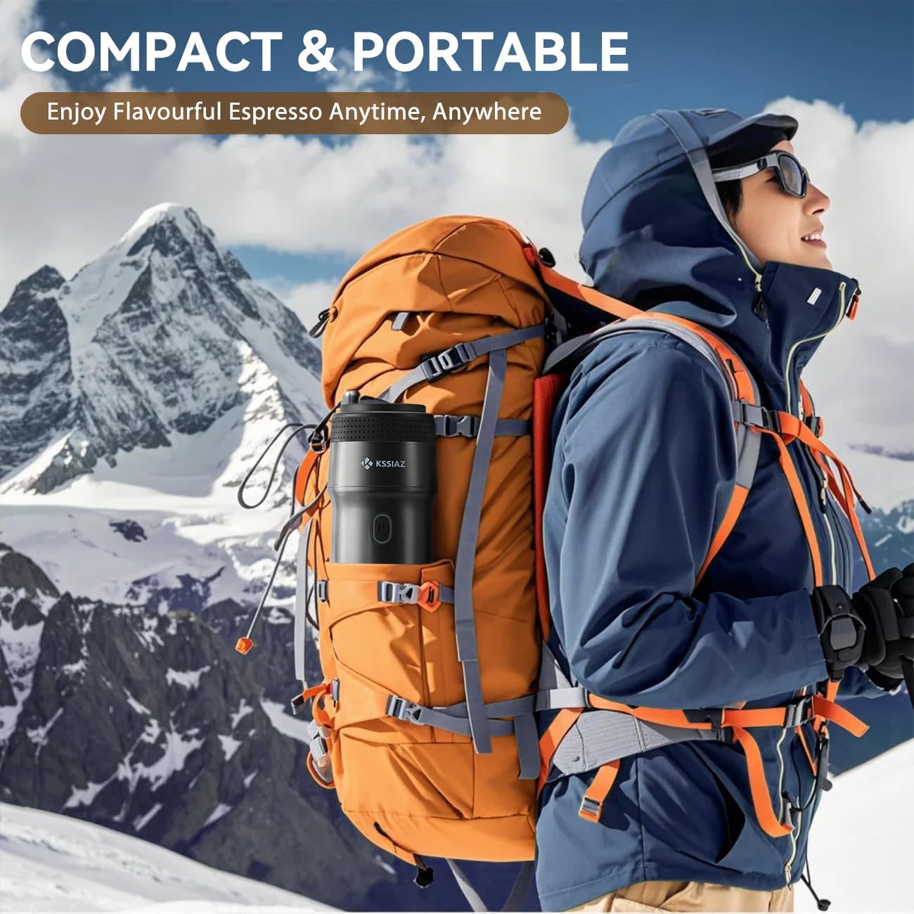 - ăPortable DesignăWith a compact design, the electric espresso maker weighs 2.4 lbs and is only the size of a water bottle. It is portable and perfect for camping, travelling and hiking. This coffee maker is compatible with 12V car charging, so you can charge it wherever you go
