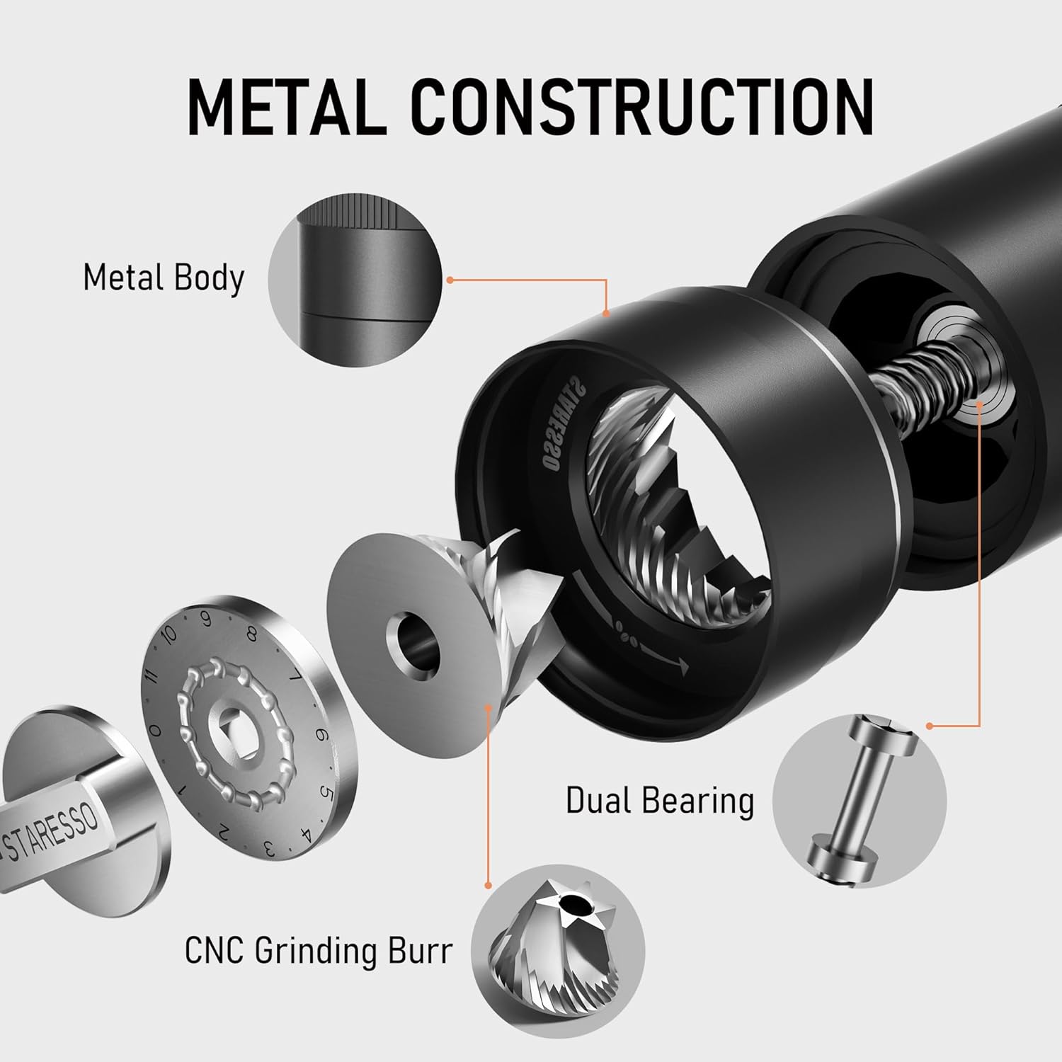 - [2025 UPGRADED VERSION] STARESSO D6 PLUS Coffee Grinder upgraded with 6-Axis CNC burr and all-metal body. Crafted from high-quality 420 Stainless Steel conical burr, it ensures uniform grinding and consistent grounds for every brew, delivering unparalleled flavor with dual bearing precision.