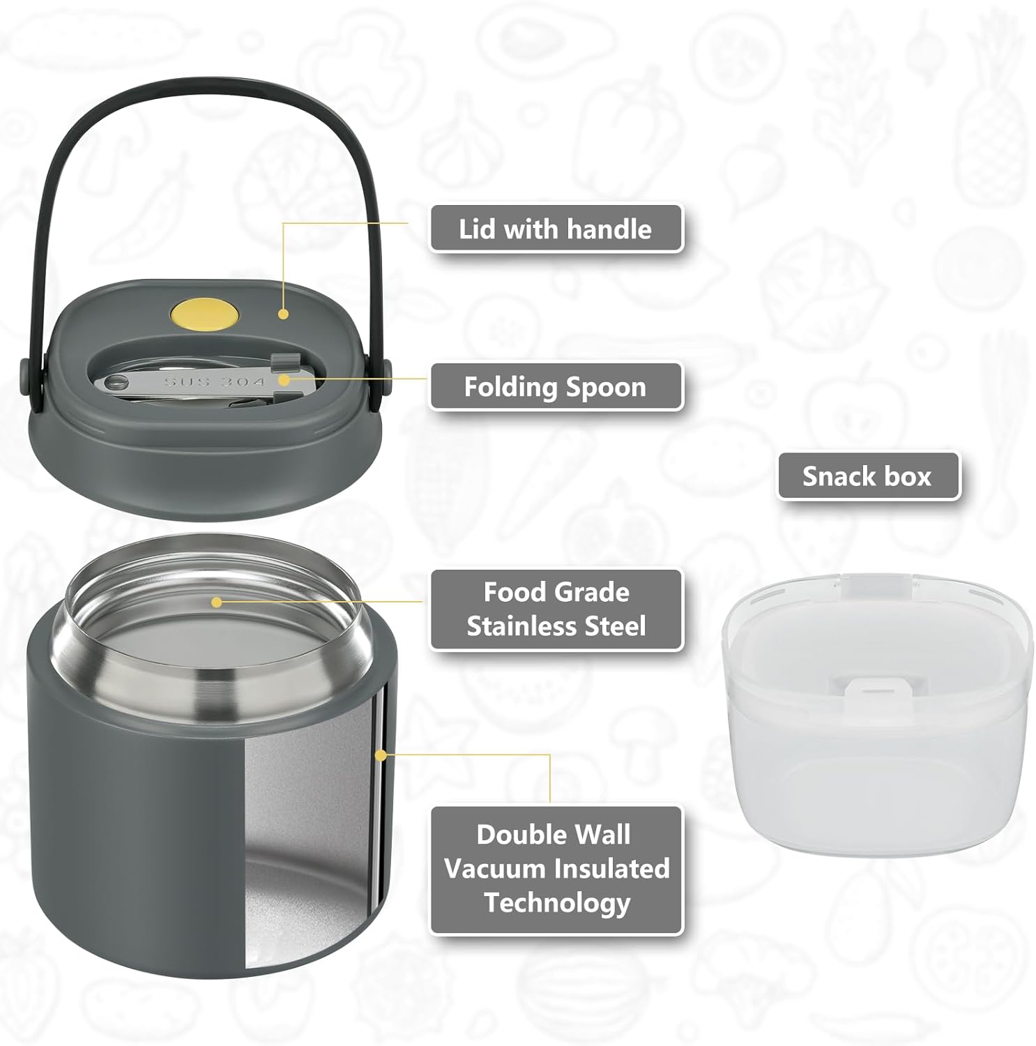 - 2-in-1 separation design - 14oz Insulated Food Jar and 6oz Snack Container combined design, separating different types of food and snacks to keep food fresh,tidy,and balanced